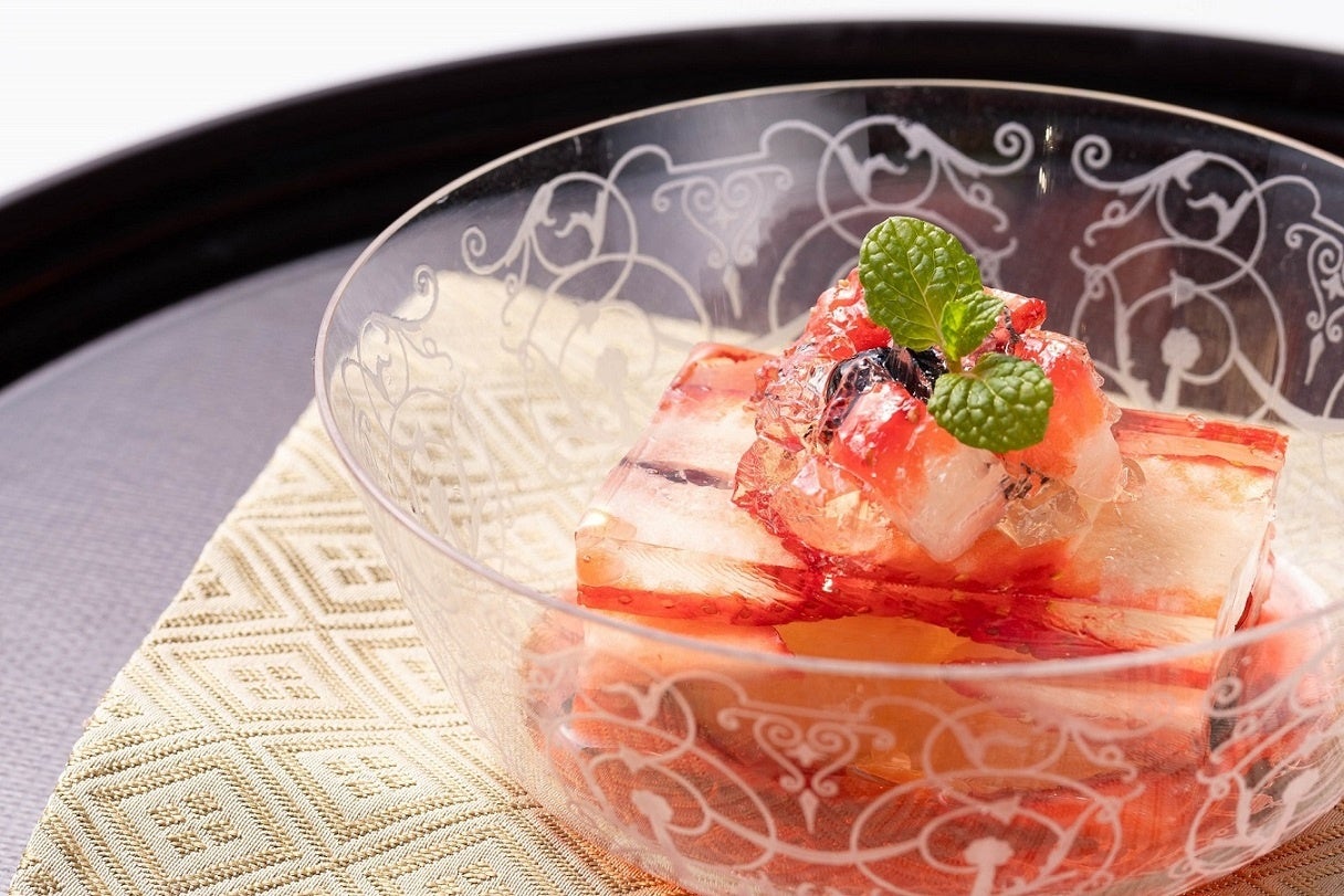「いちごさん」、せとか(果皮が非常に薄く、濃厚でジューシーな柑橘の一種)、黒豆をゼリー寄せにし、「いちごさん」のスープとともにお召し上がりいただきます。フレッシュないちごの爽やかさと火を通したいちごの甘さ、二つの魅力を同時に味わえます。シンプルながらも、「いちごさん」とせとかのみずみずしさに、ふっくらとしたやわらかな食感の黒豆がアクセントになる洗練された一品です。