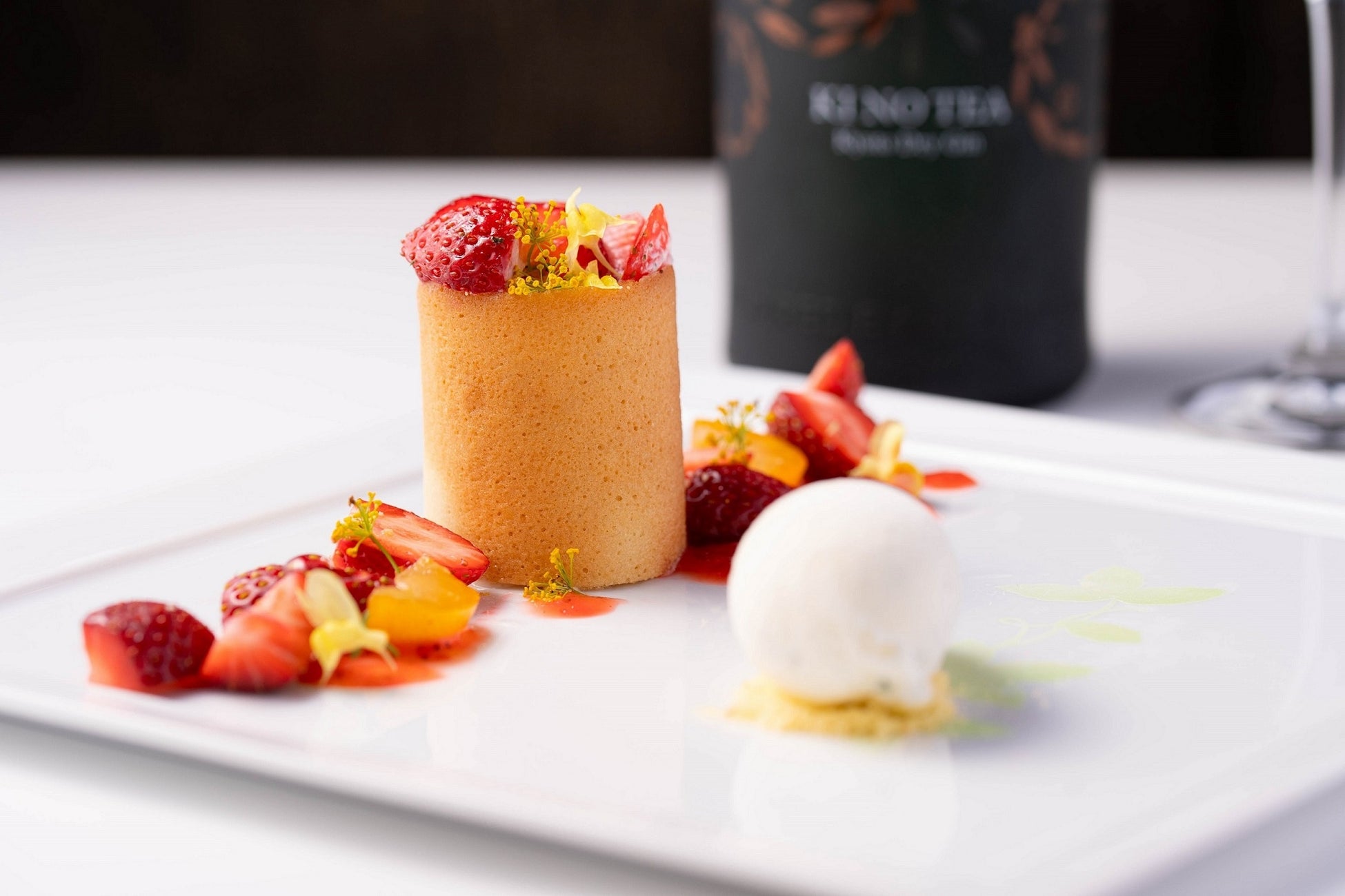 サクサクとした食感のチュイール(フランス語で「瓦」を意味し、瓦屋根をモチーフにした形状が特徴の薄焼きクッキー)の中は、フレッシュな「いちごさん」と「いちごさん」を使ったエスプーマ。お皿に金柑のコンポートと真っ赤な「いちごさん」で彩りを加え、オレンジ蜂蜜とディルのさっぱりとしたアイスクリームを添えました。甘みと酸味を生かした、みずみずしい「いちごさん」のソースとともにお召し上がりください。