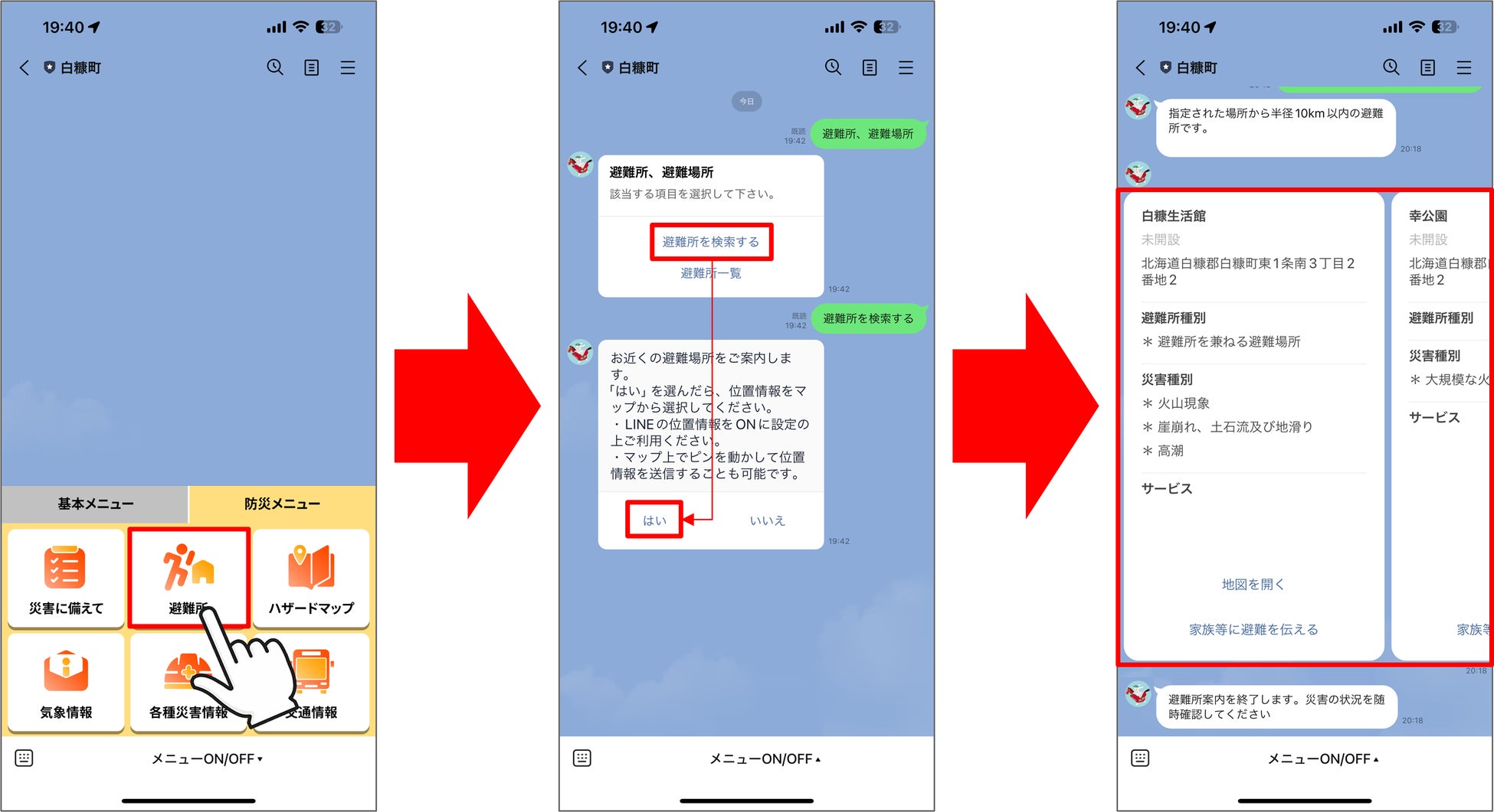 今回のリニューアルでは「避難所検索機能」を導入しています。画面の流れに沿って自身の位置情報を送信すると、近くの避難所施設一覧を検索することができます。普段から近くの避難所を確認しておき、いざとなった際にもLINE公式アカウントを利用して、安心して行動することができます。