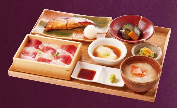 鮪と鯛の華やかな紅白ちらし、出世魚の鰤の照り焼き、小割烹おはし自慢の京都おばんざい2種が付いた贅沢な御膳です。
