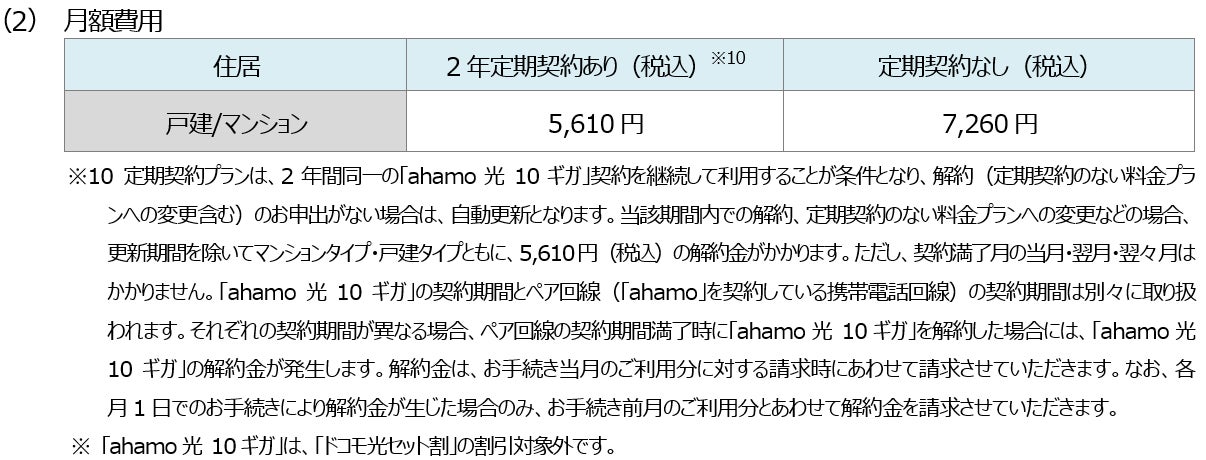 ※3 定期契約プランは、2年間同一の「ahamo光 10ギガ」契約を継続して利用することが条件となり、解約(定期契約のない料金プランへの変更含む)のお申出がない場合は、自動更新となります。当該期間内での解約、定期契約のない料金プランへの変更などの場合、更新期間を除いてマンションタイプ・戸建タイプともに5,610円(税込)の解約金がかかります。ただし、契約満了月の当月・翌月・翌々月はかかりません。「ahamo光 10ギガ」の契約期間とペア回線(「ahamo」を契約している携帯電話回線)の契約期間は別々に取り扱われます。それぞれの契約期間が異なる場合、ペア回線の契約期間満了時に「ahamo光 10ギガ」を解約した場合には、「ahamo光 10ギガ」の解約金が発生します。解約金は、お手続き当月のご利用分に対する請求時にあわせて請求させていただきます。なお、各月1日でのお手続きにより解約金が生じた場合のみ、お手続き前月のご利用分とあわせて解約金を請求させていただきます。