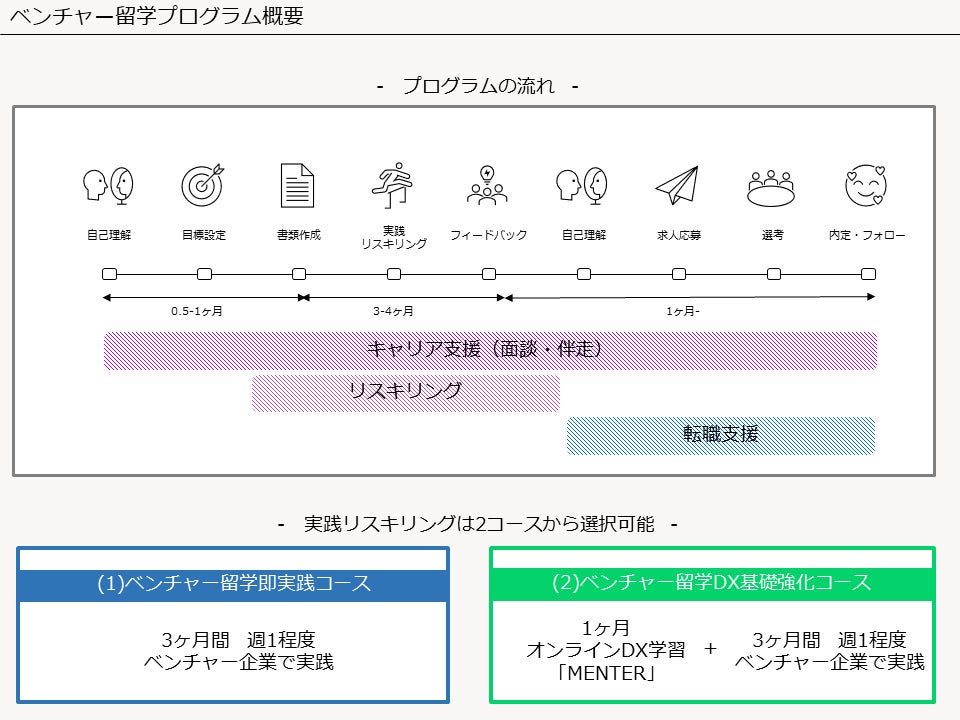 「ベンチャー留学」は、キャリア相談、ベンチャー企業での実践経験(リスキリング)、転職を一気通貫で支援するプログラムで、即実践とDX基礎強化の2コースを用意。DX基礎強化コースは、デジタルに強い人材を育成するオンライン学習サービス 「MENTER(https://menter.jp/)」を提供するWHITE株式会社(神奈川県横浜市、代表取締役社長 横山 隆)と提携し、DXスキルの強化に特化しています。