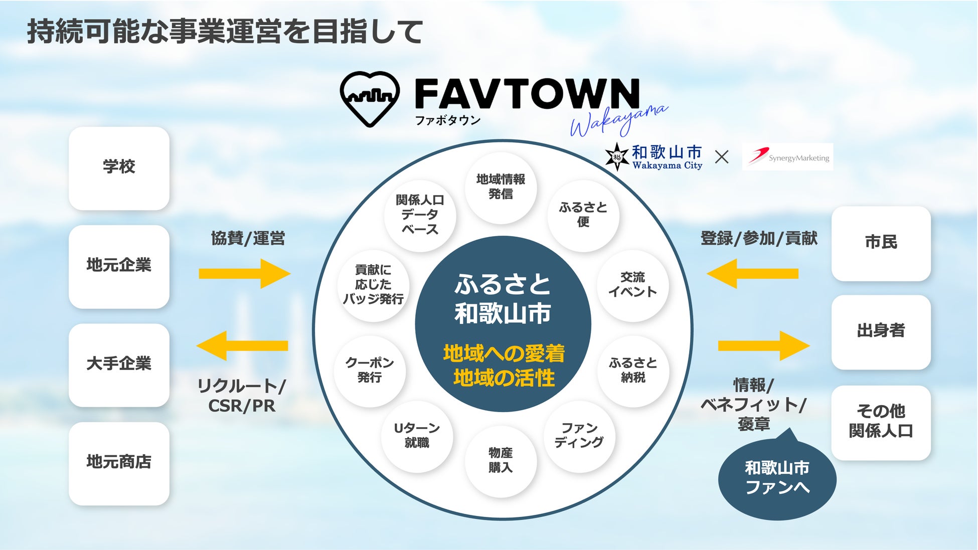 「FAVTOWN」は、当社のCRMやデジタルマーケティングの専門知識を活かしたデジタルプラットフォームです。「FAVTOWN」とは、‘Favorite Town(お気に入りのまち)’を略して名付けました。「FAVTOWN」の企画に際しては、全国的に進む少子高齢化の加速に加え、都市圏への人口流出を課題とする地方都市などに向け、「地元が好き」という想いを持つ転出者などとつながり、地域の情報提供や住民との交流を促し、ふるさとへの愛着を深め、育むことを目的としました。まずは実証事業として、上記課題を持っていた和歌山市と連携協定を結び実施をいたしました。