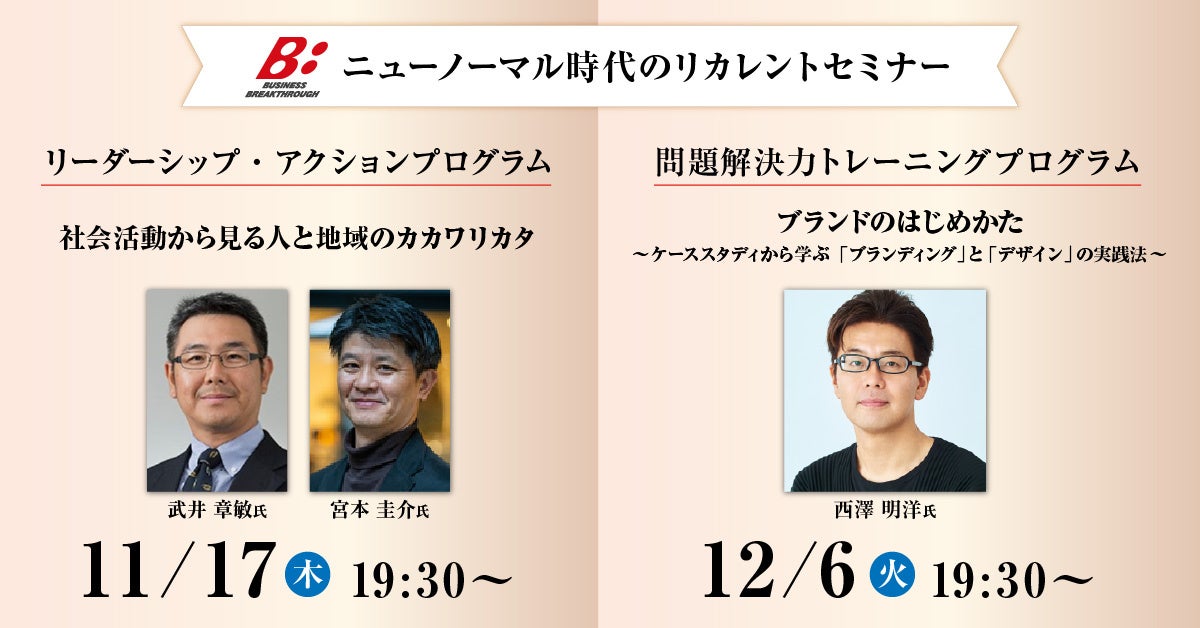 あらゆる年齢層に対し生涯にわたるリカレント教育(※)を提供する株式会社ビジネス・ブレークスルー(東京都千代田区、代表取締役:柴田巌、以下BBT)が運営する2つのプログラム(リーダーシップ・アクションプログラム、問題解決力トレーニングプログラム)は、『ニューノーマル時代のリカレントセミナー』を11月、12月にオンラインライブ形式で開催いたします。