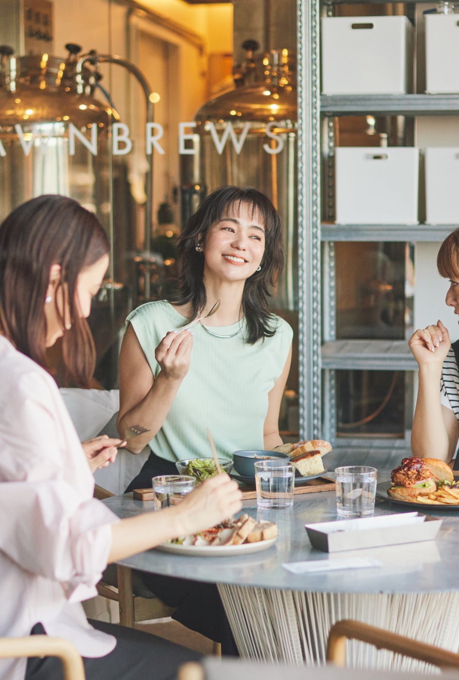 友人たちとのランチのシーン。ノースリーブも自信を持って着こなせるゴキゲンな日。