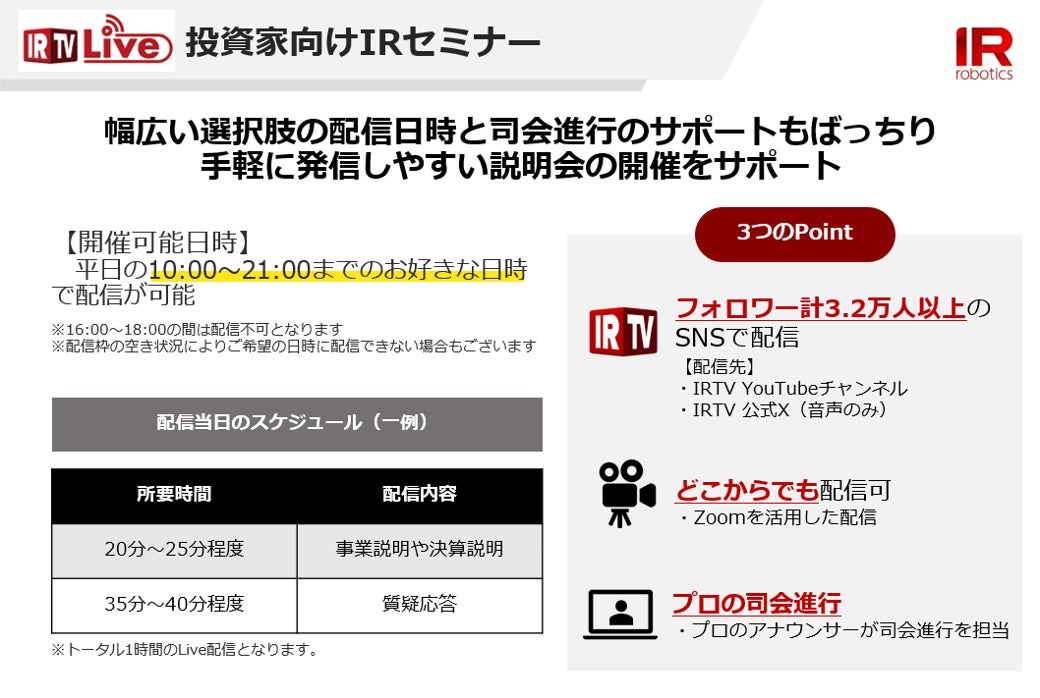 株式会社IR Roboticsは独自のIRメディア=IRTV for YouTubeから手軽に発信できる投資家向けIRセミナーのサービスをリリースいたしました。