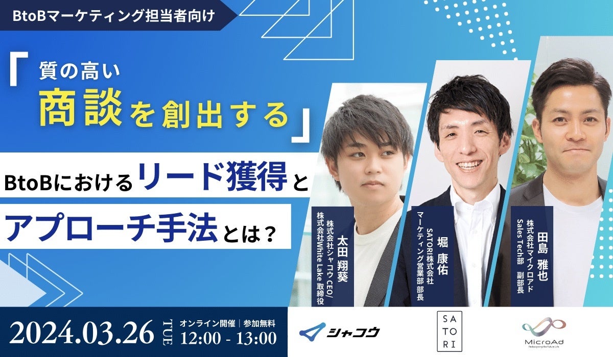 株式会社マイクロアド(本社:東京都渋谷区、代表取締役社長:渡辺健太郎、以下 マイクロアド)は、企業のBtoBマーケティング担当者に対し、SATORI株式会社、株式会社シャコウとともにオンラインセミナーを開催いたします。