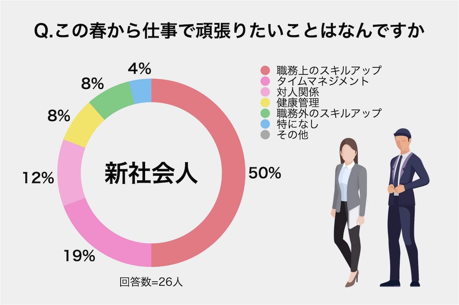 新社会人がこの春から仕事で頑張りたいこと1位は「職務上のスキルアップ」で半数が選択し、2位の「タイムマネジメント」19%から大きく差をつけました。