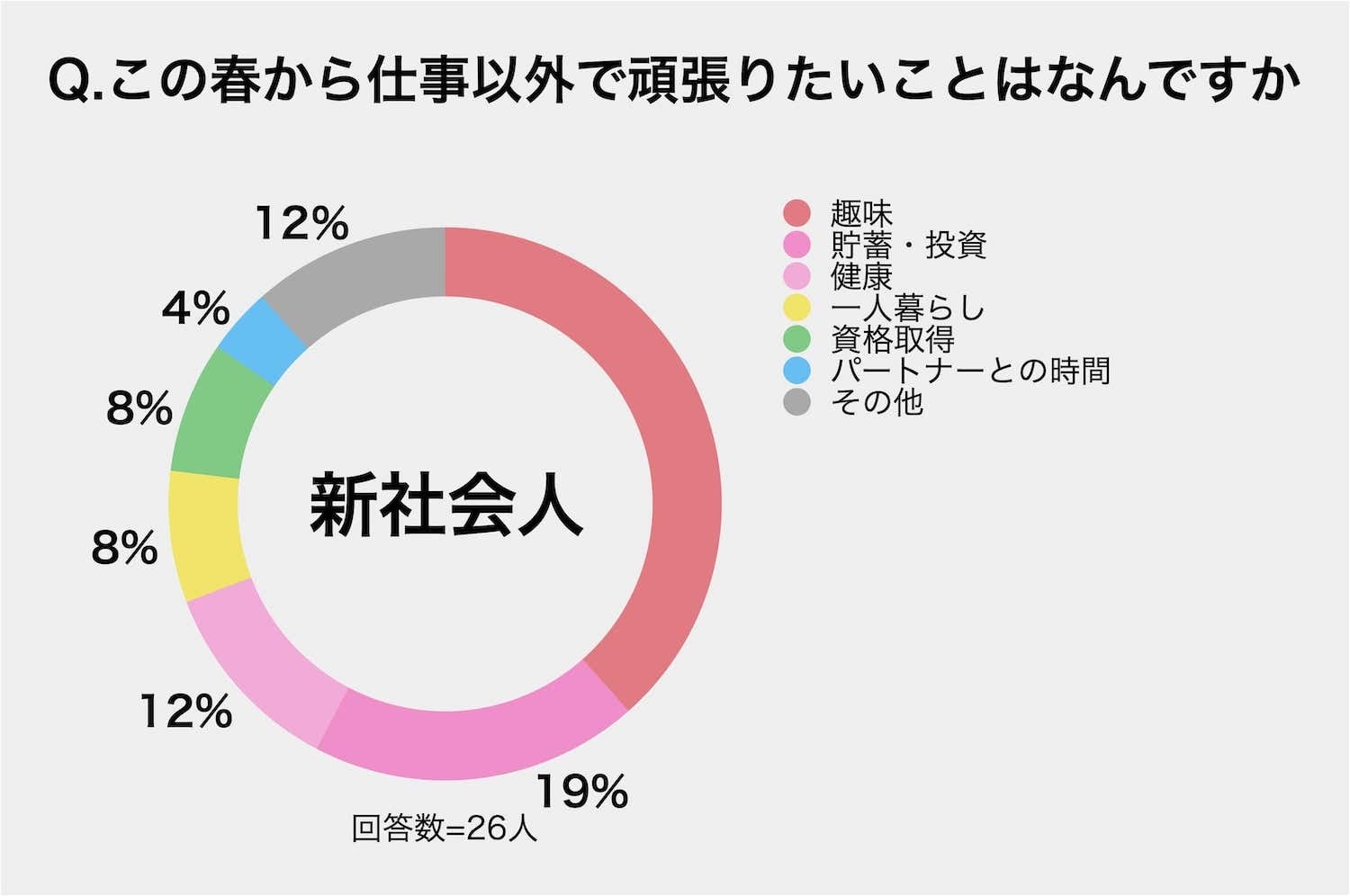 新社会人が仕事以外で頑張りたいこと1位は「趣味」で、38%の人が選択しました。また2位は「貯蓄・投資」となっており、社会人としての資産形成が重要視されています。