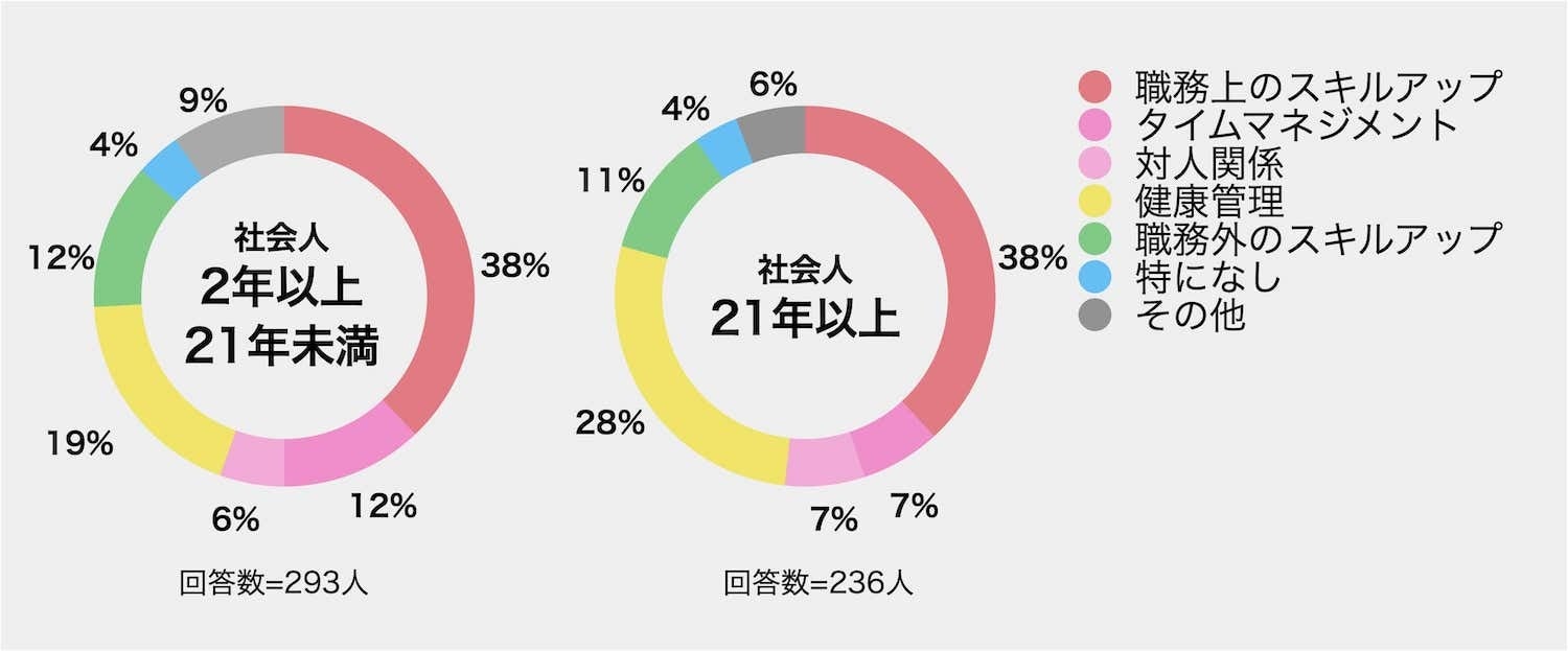 「職務上のスキルアップ」を選択した割合は、社会人歴が2年以上21年未満は38%、21年以上は22%と社会人歴が長い程その割合は少なくなりました。また、社会人歴21年以上の人が最も多く選択したのは「対人関係」となっており、いわゆる中間管理職で「上司」と「部下」の両方のポジションにいることが背景と考えられます。