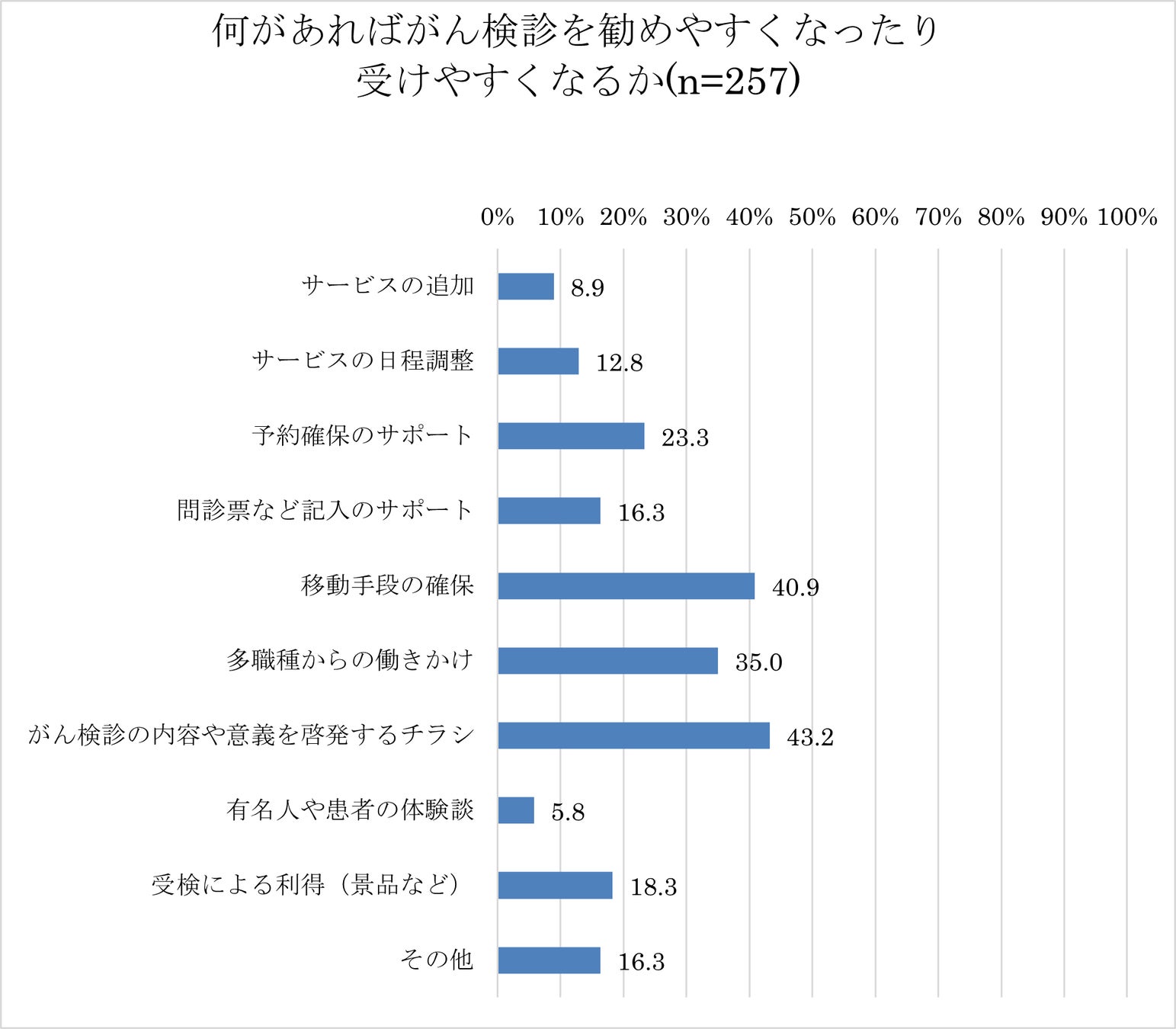 また、「がん検診の内容や意義を啓発するチラシ」があれば勧めやすくなったり、利用者やその家族ががん検診を受けやすくなると回答したケアマネジャーも多くいました。