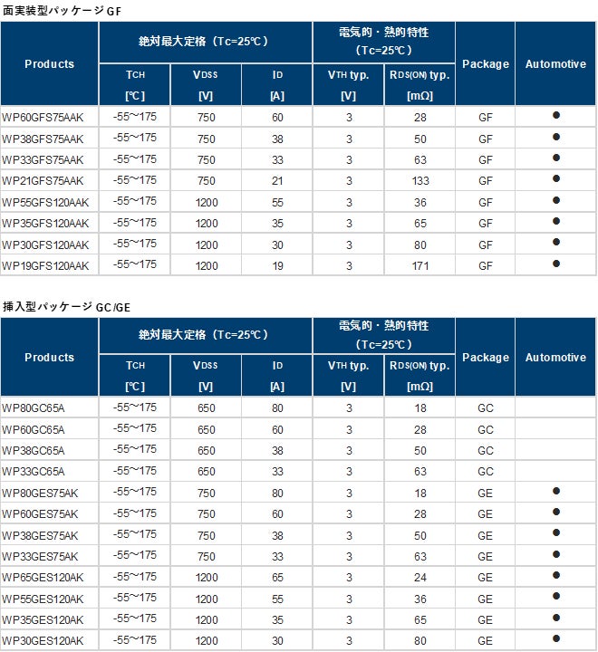 こうしたニーズと課題に対応するため、新電元工業では、車載用途にも展開可能な650V、750V、1,200V耐圧のSiC-MOSFETを開発しています。