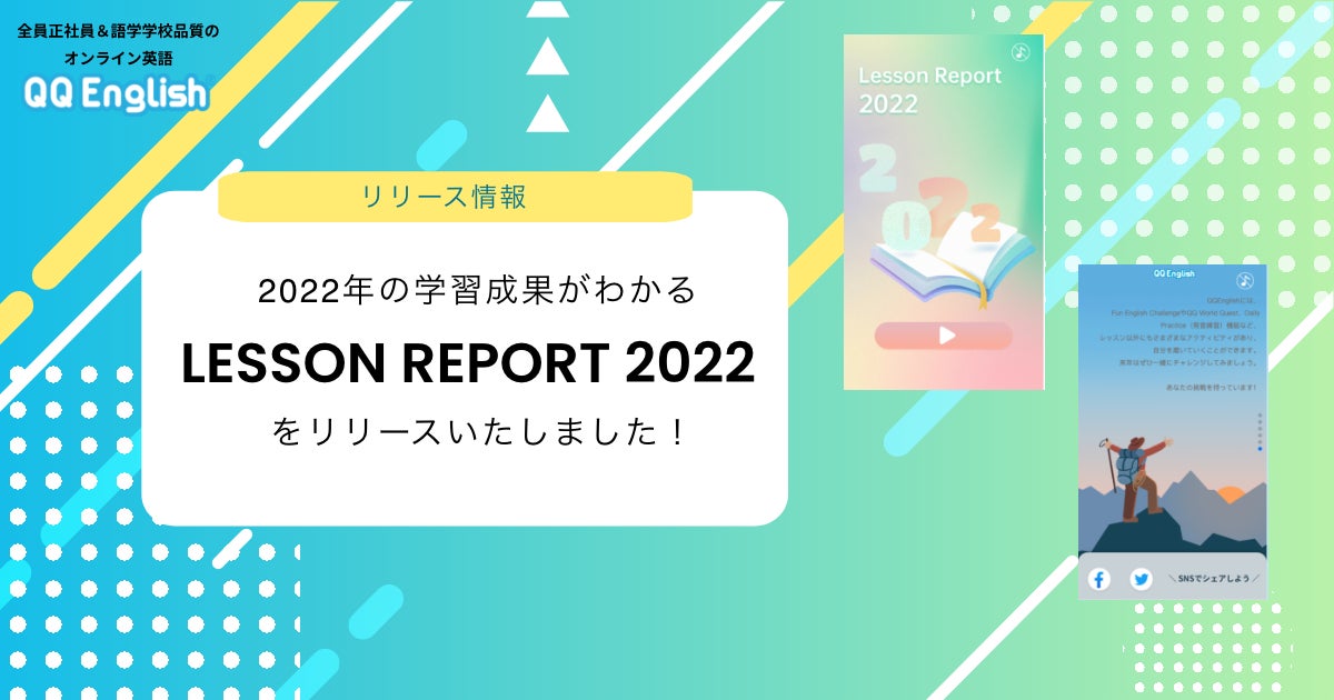 株式会社QQEnglish (本社:東京都渋谷区、代表取締役:藤岡 頼光)が提供するオンライン英会話サービス「QQEnglish」「QQキッズ」にて、会員さまがご自身の2022年の学習成果を確認できる「LESSON REPORT 2022 」をリリースしたことをお知らせいたします。