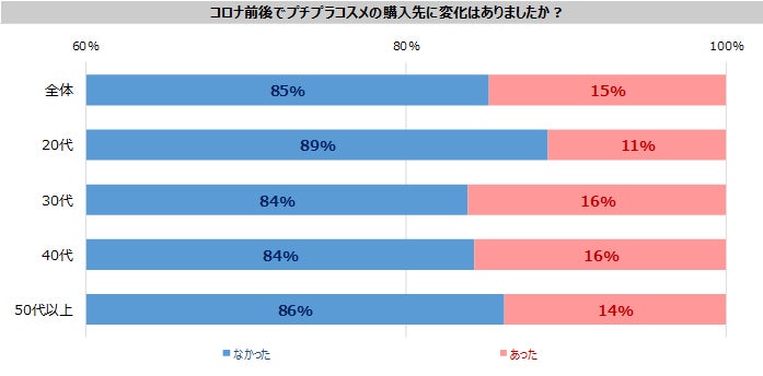 コロナ禍でプチプラコスメを購入頻度に変化があった方のフリーコメントでは「マスク生活によって化粧の頻度が落ち、購入回数が減った」、「巣ごもり生活の中でSNSを見る機会が増え、そこで見たプチプラコスメを買う頻度が増えた」という回答が多くみられました。コロナ前後で購入場所に大きな変化は見られませんでしたが、中には「コロナで遠出を控えるようになってから近所のドラッグストアで手に入るプチプラコスメの購入頻度が高くなった」という声もあり、コロナによって少なくともコスメの消費動向にも影響はあったという結果となりました。