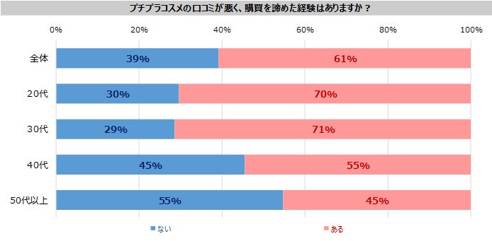 61%の方がお気に入りのプチプラコスメブランドがあり、購入する上で最も重視していることは「機能性」、次に「色味」「価格」でした。口コミをチェックする方は70%と非常に多く、コスメ情報サイトで確認しているようです。良い評価を参考に購入を決めた方は77%、反対に悪い口コミを参考に購入を諦めた方は61%いることがわかりました。