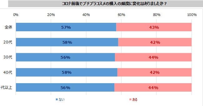 プチプラコスメを購入したことがある方は全体で81%、年代が若くなるにつれて購入率は高くなり20代は92%となっています。購入したいと思うプチプラコスメを知るきっかけは20代から40代はインスタグラムを中心としたSNS、50代以上は店舗でした。購入先は年齢問わずドラッグストアが最も多い結果となりました。コロナ前後で購入頻度の変化は「ある」が43%、「ない」が57%と分かれており、プチプラコスメを知るきっかけや購入場所については大きな変化はないようでした。