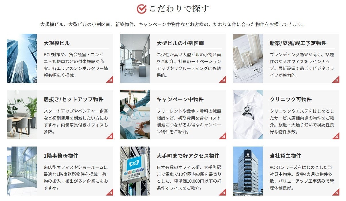 お客様からのご要望にお応えし、「大型ビルの小割区画」「居抜き/セットアップ物件」「大規模ビル」「新築/築浅/竣工予定物件」など、こだわり条件にあった物件を探すことができるようになりました。