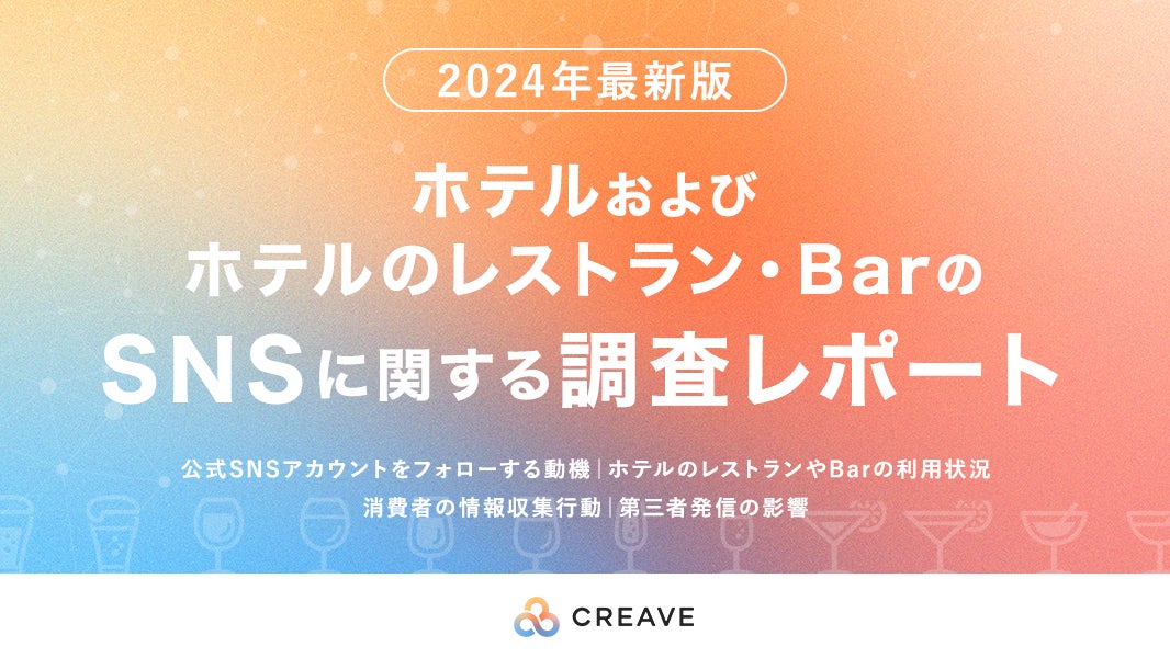クリエイターとの共創を通じて企業のマーケティング課題を解決する、株式会社CREAVE(本社:東京都千代田区、代表取締役社長:中村真奈、以下 CREAVE)は、ホテルに関する消費者のSNS行動を調査した「ホテルおよびホテルのレストラン・BarのSNSに関するアンケート調査レポート」を公開します。