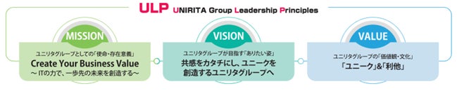 このULPは、ユニリタグループとして「大切にすべきこと=VALUE」を示し、社内外のステークホルダーに「使命・存在意義=MISSION」と「ありたい姿=VISION」がより分かりやすく伝わることにこだわりました。「MISSION」にある「Create Your Business Value」の「Your」とは、私たちを取り巻くステークホルダーです。私たちは、その多様な「Your」とのつながりをもっと広く深くしていくために「お客様の立場になって」、「Value」を追求し創造していくこと、これが、私たちの目指す「MISSION」です。そのために、「VISION」は「共感をカタチにし、ユニークを創造するユニリタグループへ」としています。