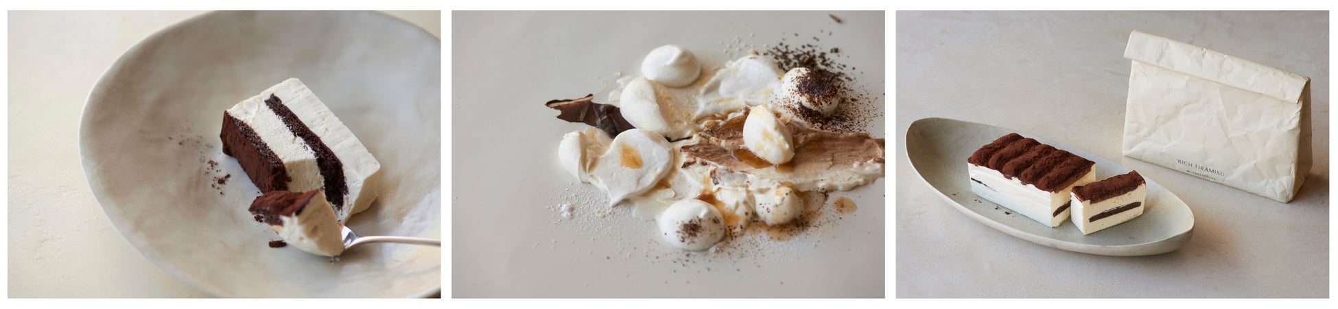 コーヒーやカカオ、ほうじ茶が生み出す香ばしい香りと、ムースのように淡い口溶けが特長のティラミス。冷凍のままカットし、温度によって変化する味わいと香りをお楽しみください。オリジナルの保冷バッグに入れてお渡しします。