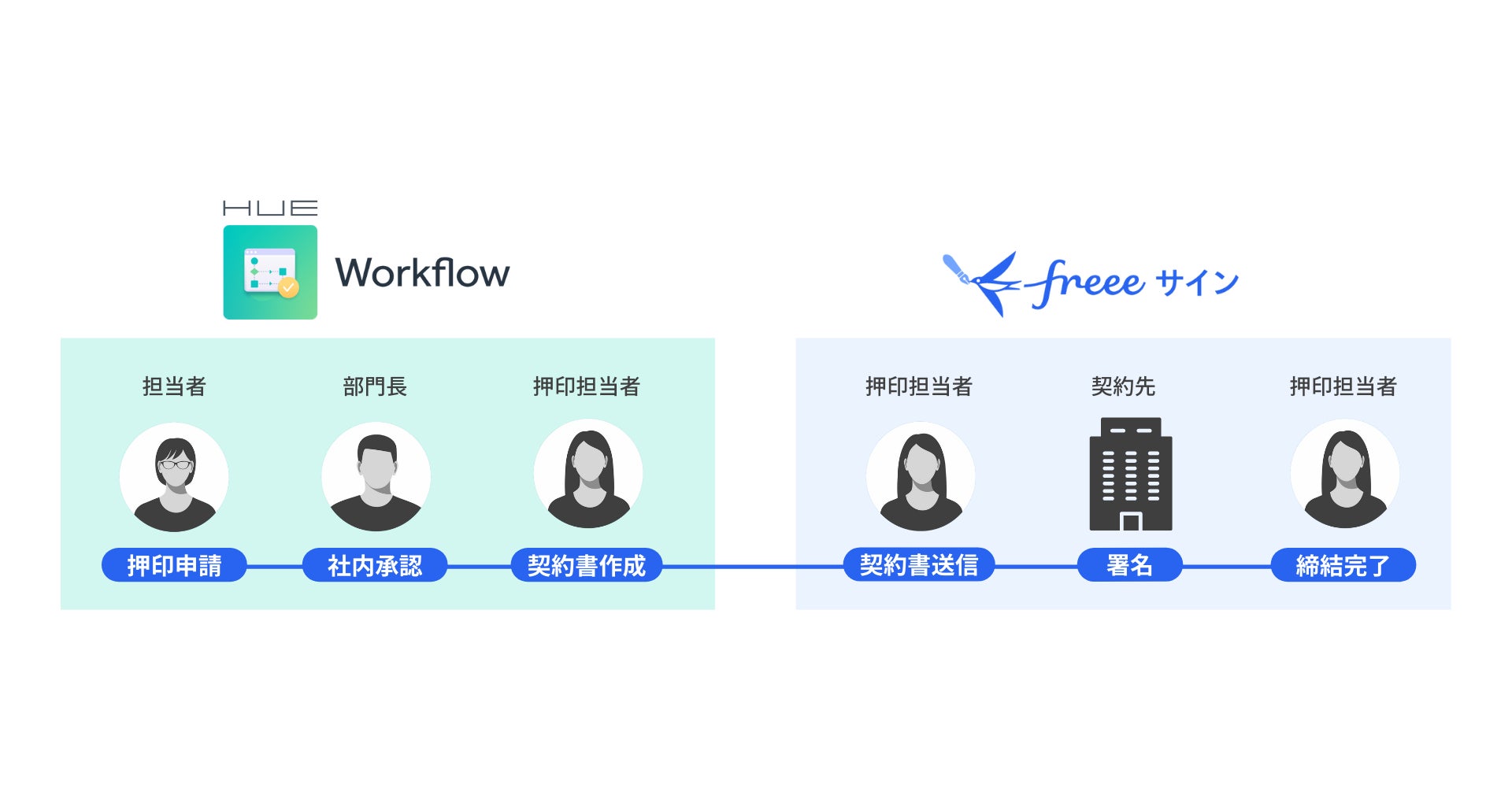 今回の連携により、「HUE ワークフロー」上で社内承認された契約書はワンクリックで「freeeサイン」に遷移し契約先へ送信できます。入社関連書類などの自社内での契約締結はもちろんのこと、社外の契約相手方への契約書送信・締結・返送・保管までをシームレスに実現します。
