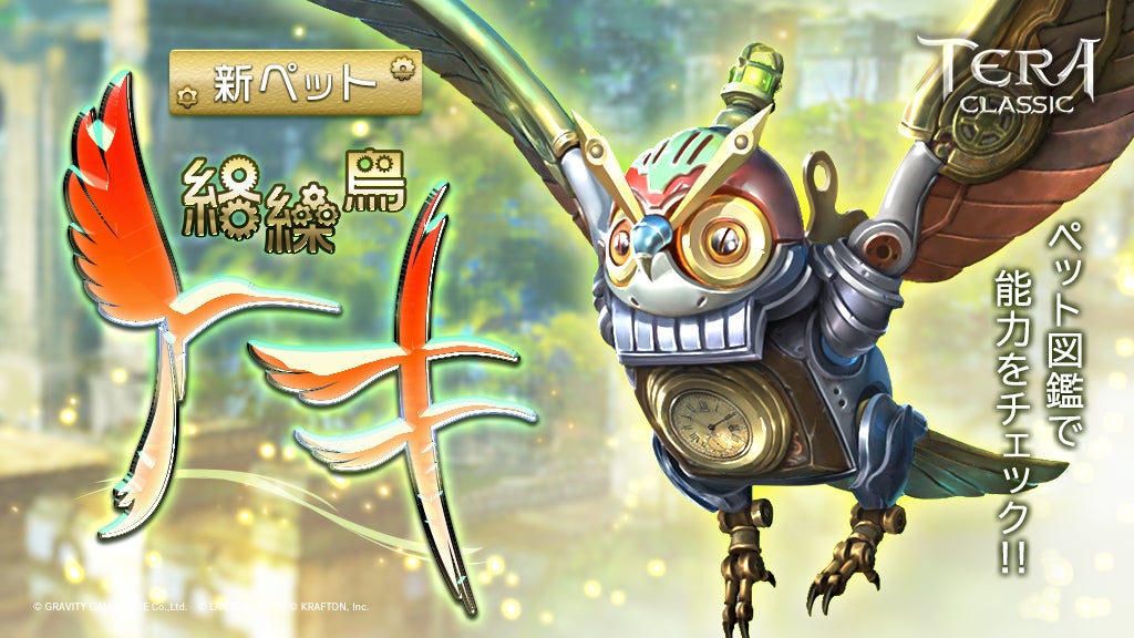 新ペット「絡繰鳥トキ」登場です!一定のダメージを無効にするシールドを付与し、移動速度を増加する能力や、『回避』を強化する能力を持っています。頼りになる絡繰鳥トキと一緒にアルボレアを冒険しましょう!