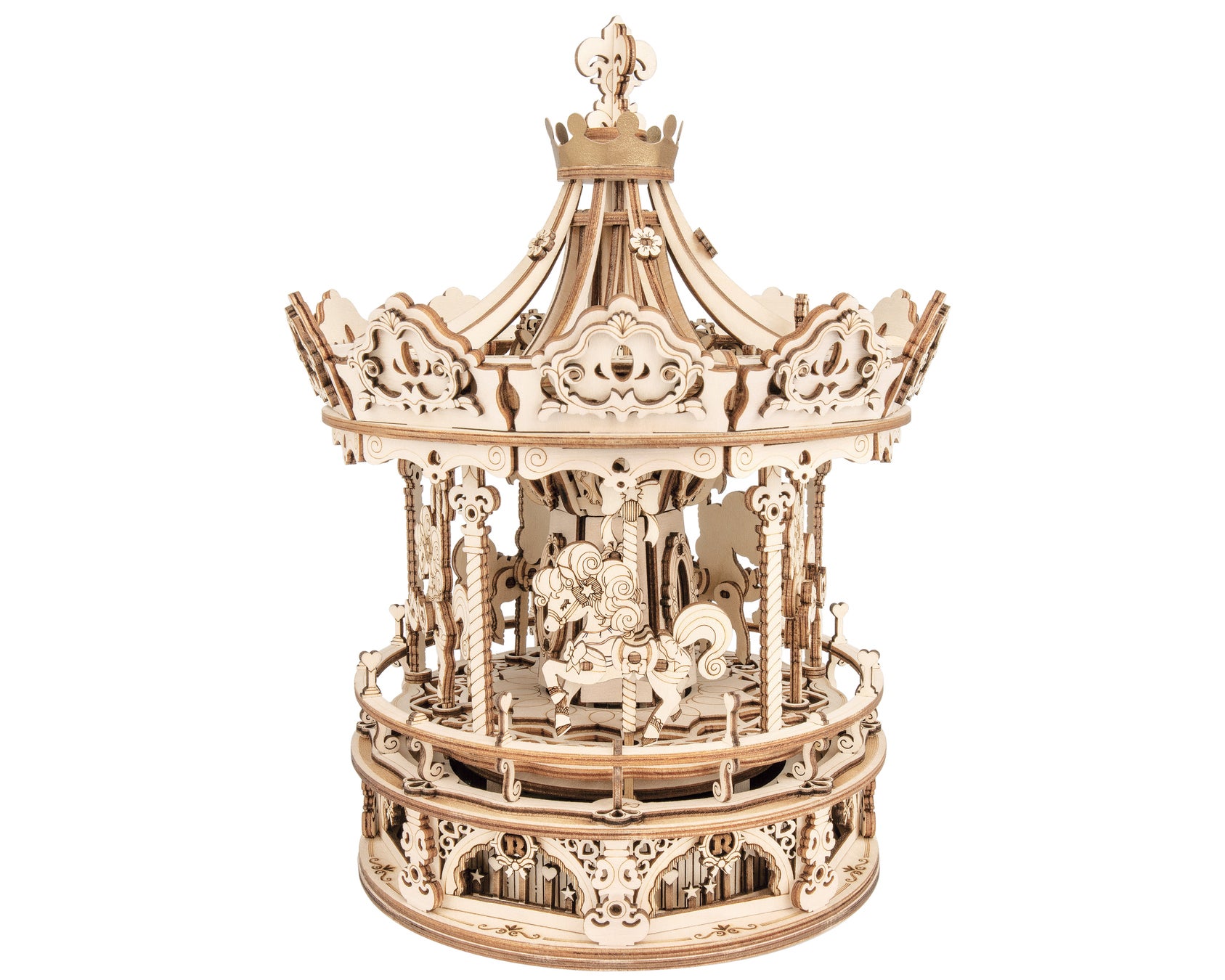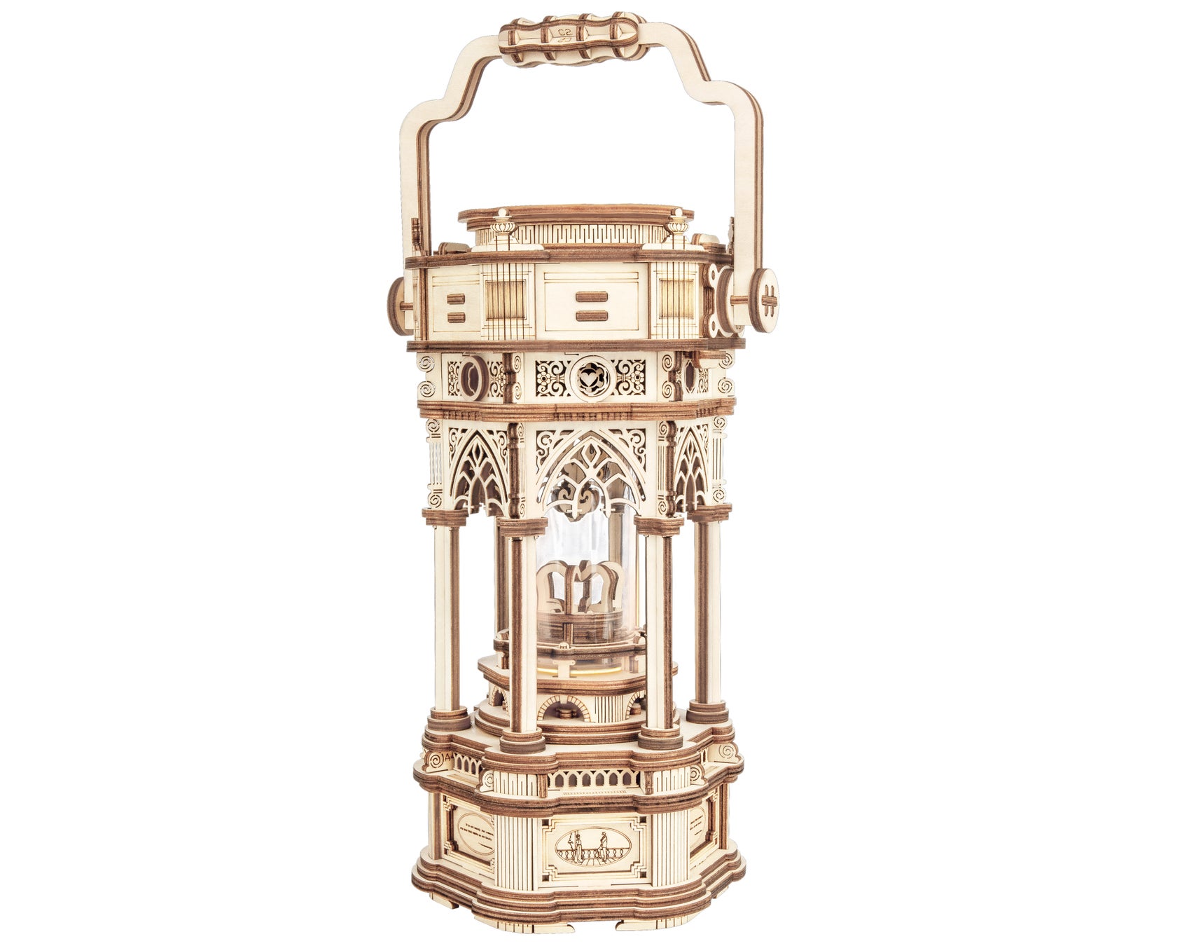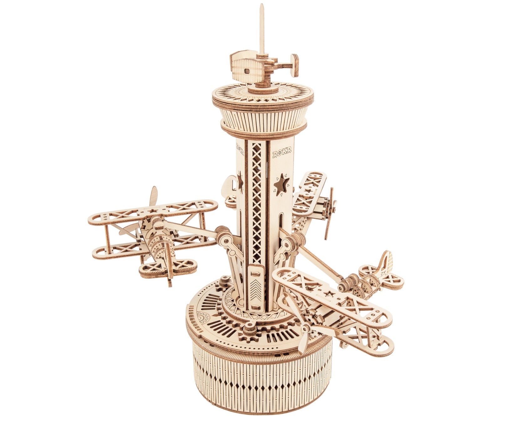 ぜんまいを回すと音が流れて各パーツが動くオルゴールシリーズは、つくるときはもちろん、つくったあとも楽しい3Dウッドパズル。「コントロールタワー」は真ん中にある管制塔がくるくると回り、飛行機が上下に動きます。「ランタン」は真ん中の透明なアクリルチューブが、「ポニーカルーセル」は木馬部分が上下に動きます。ひとつずつ組み立てたパーツ同士が、かみ合って動いた時には達成感に包まれます。
