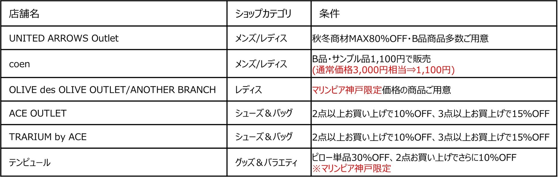 9月17日(土)~9月19日(月・祝)の期間、46店舗で「マリンピア神戸」限定の特別価格アイテムが登場いたします。「OLIVE des OLIVE OUTLET/ANOTHER BRANCH」は、マリンピア神戸限定価格のアイテムが登場するほか、「UNITED ARROWS Outlet」は、最大で80%OFFとなります。このおトクなチャンスに、マリンピア神戸にお越しください。