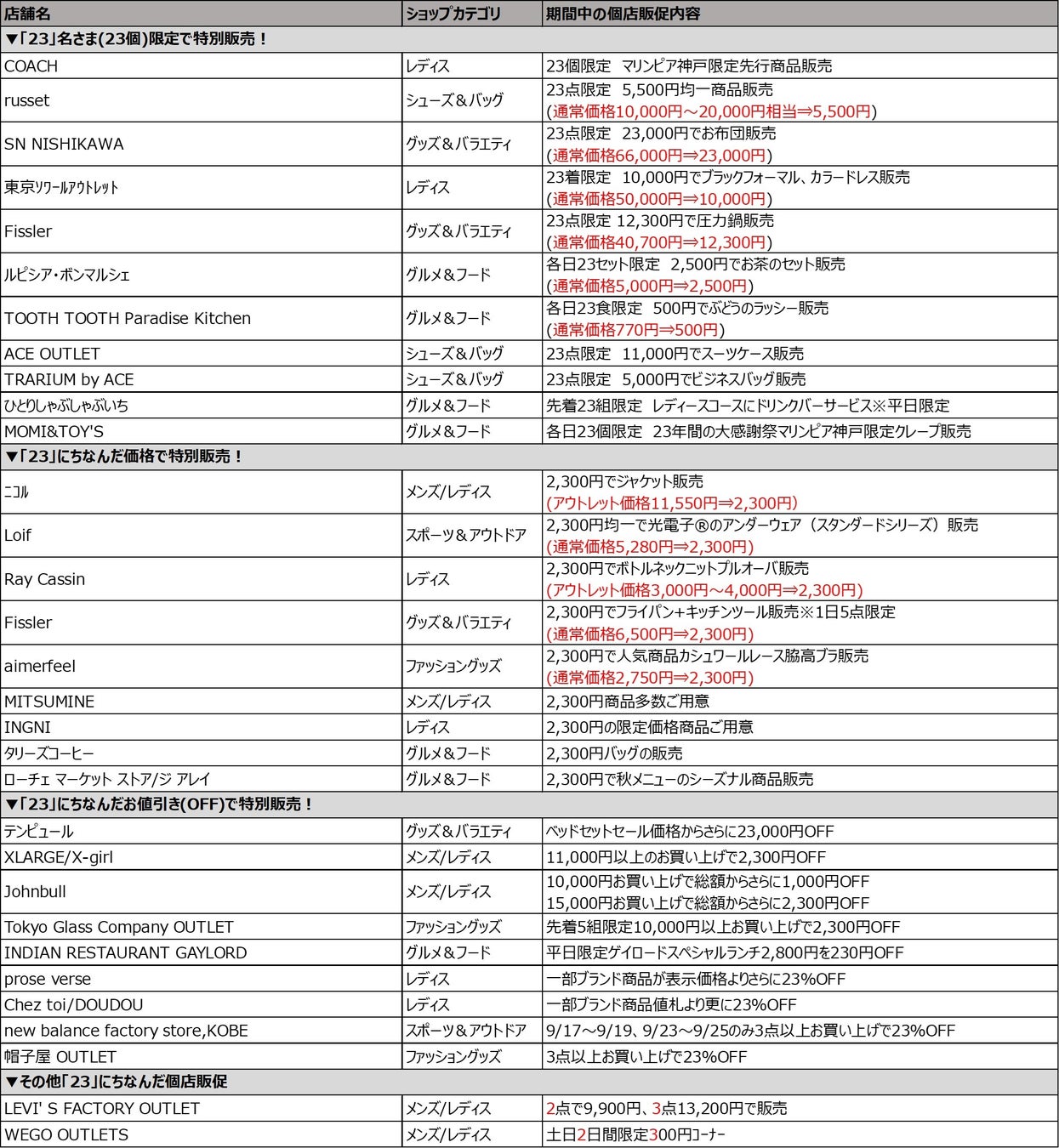 23年間のご愛顧に感謝を込めたセールとして、2022年9月14日(水)~10月2日(日)の期間、「三井アウトレットパーク マリンピア神戸 23年間の大感謝祭」を開催いたします。約40店舗が参加する23年の歴史にちなんだ「23」に関係するキャンペーンの開催をはじめ、各店舗おススメのコーディネートが2,300円(税込)でお楽しみいただけるキャンペーンなど、おトクなチャンスが目白押しです。そのほかにも、マリンピア神戸限定ノベルティのプレゼントや、マリンピア神戸限定価格のアイテムの登場など、おトクにお買い物をお楽しみにいただけるほか、ご家族でお楽しみいただけるイベントも多数開催いたします。