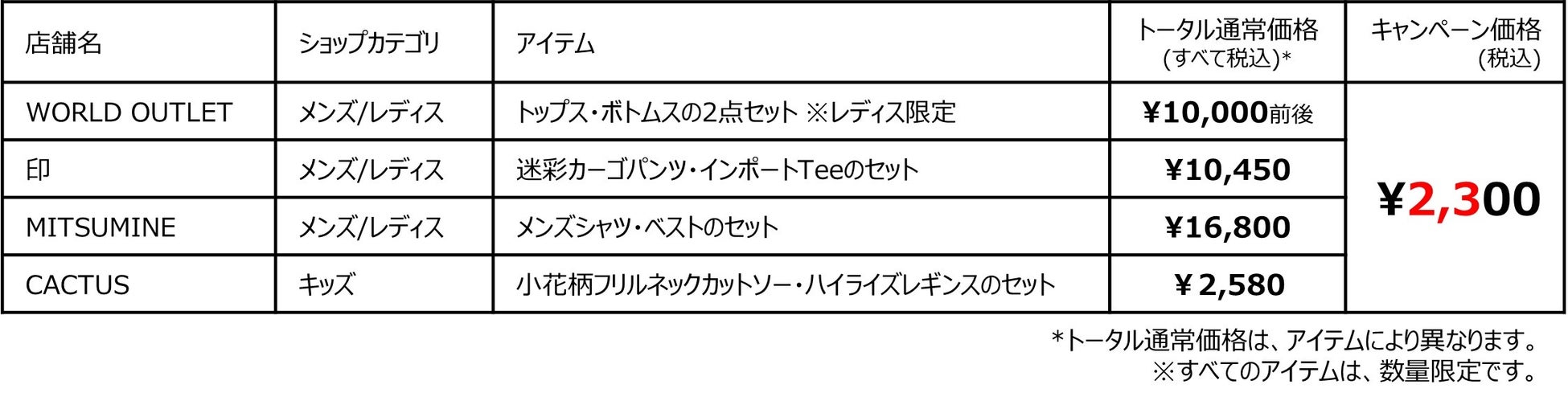9月17日(土)~9月19日(月・祝)の期間、各店舗おススメのアイテムが2,300円(税込)でコーディネートできるキャンペーンを開催いたします。「WORLD OUTLET」はレディス限定でこの秋におススメのトップスとボトムスの2点セット通常約10,000円が2,300円(税込)で登場するほか、「印」は迷彩カーゴパンツとインポートTeeの2点セットや、「MITSUMINE」はメンズシャツとベストのセットなど、おススメのコーディネートが2,300円(税込)でお買い求めいただけます。このおトクなチャンスに、新しい自分スタイルに挑戦してみてください!