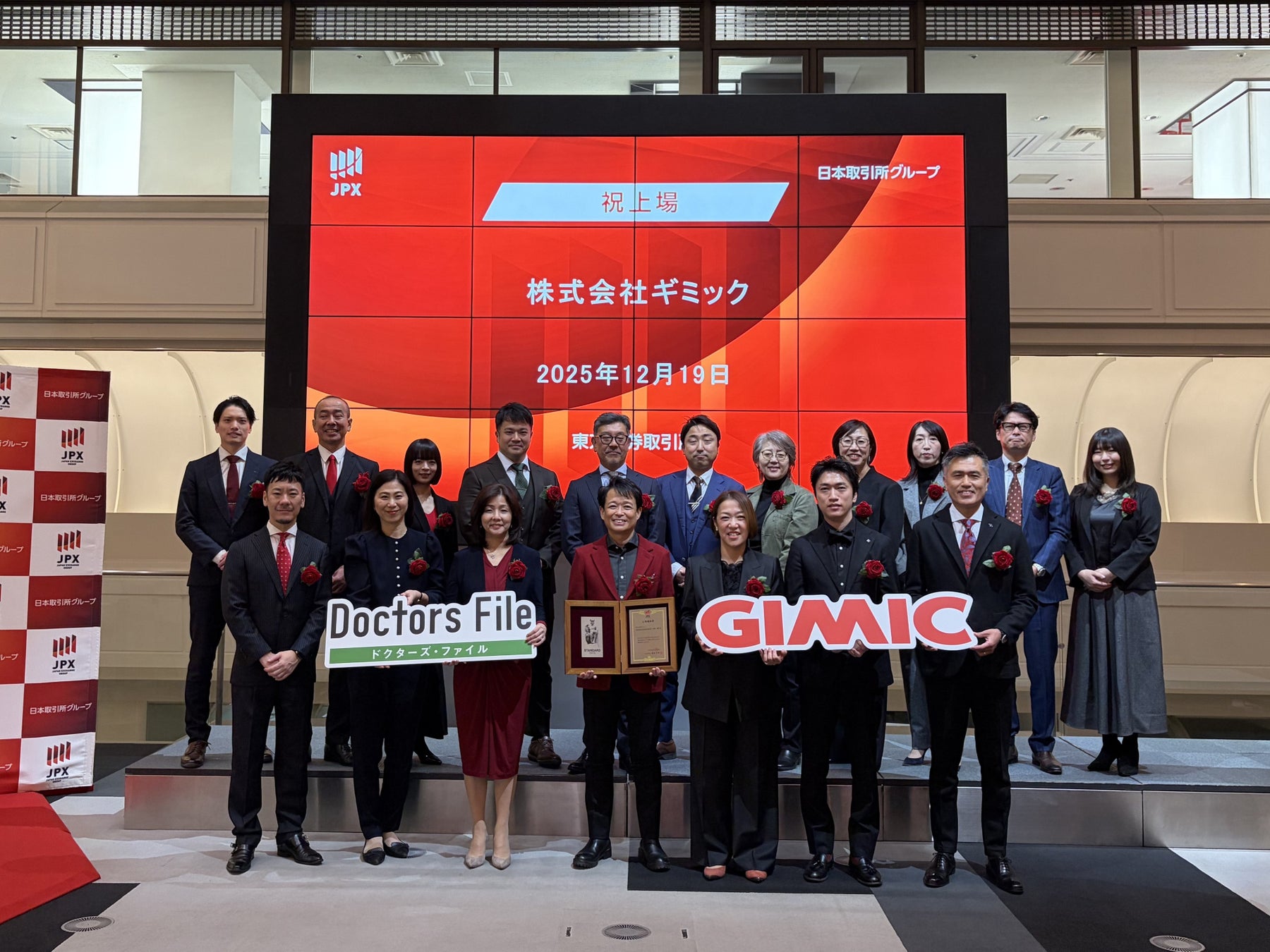 日本最大規模の医療情報サイト「ドクターズ・ファイル」をはじめ、医療特化型プラットフォーム事業を展開する株式会社ギミック(本社:東京都渋谷区、代表取締役:横嶋 大輔、以下「当社」)は、本日2025年12月19日、東京証券取引所スタンダード市場(証券コード:475A)へ新規上場(IPO)いたしました。