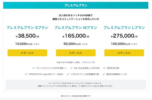 プレミアムプラン:月額38,500円(月10,000PV)から、平面認識機能、及び画像認識機能(8th Wallを使用したAR作成)を商用利用いただくことが可能なプランです。