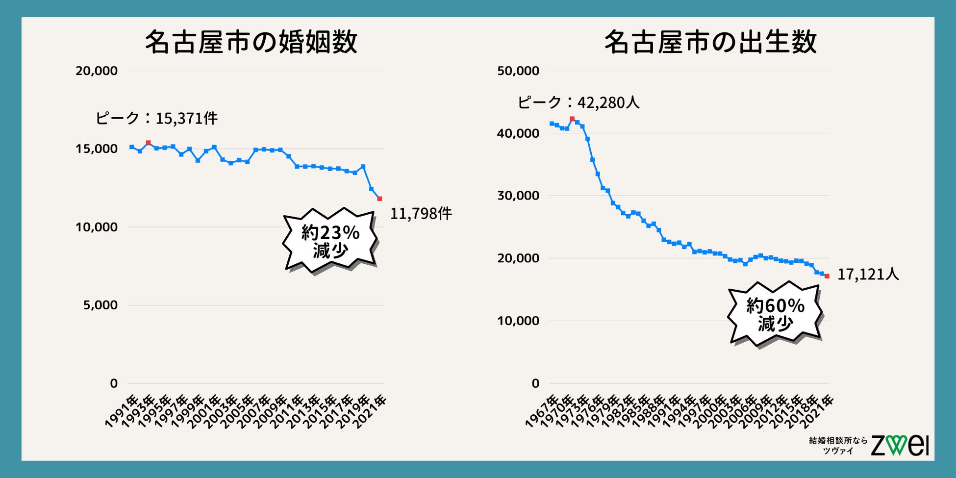 名古屋市の婚姻数・出生数は近年減少しており、1993年に15,371件だった名古屋市の婚姻件数は、2021年では11,798件と約23%減少(※1)。出生数は1971年の42,280人から、2021年には17,121人と約60%減少しています(※2)。