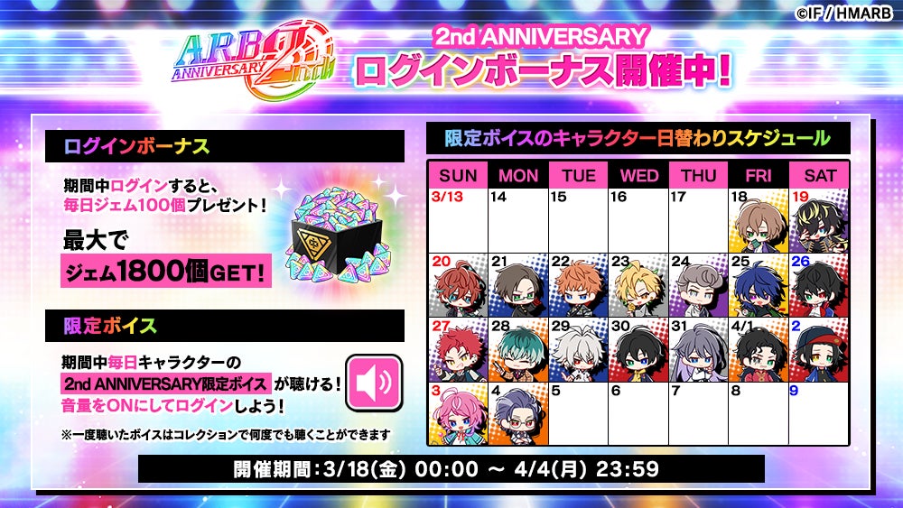 期間中、ログインすることで毎日100個ジェムを獲得できるログインボーナスを実施します。また、ログイン時にはキャラクターの2nd ANNIVERSARY限定ボイスを聴くことができます。限定ボイスは日替わりとなっていますので、どうぞお聴きのがしなく。