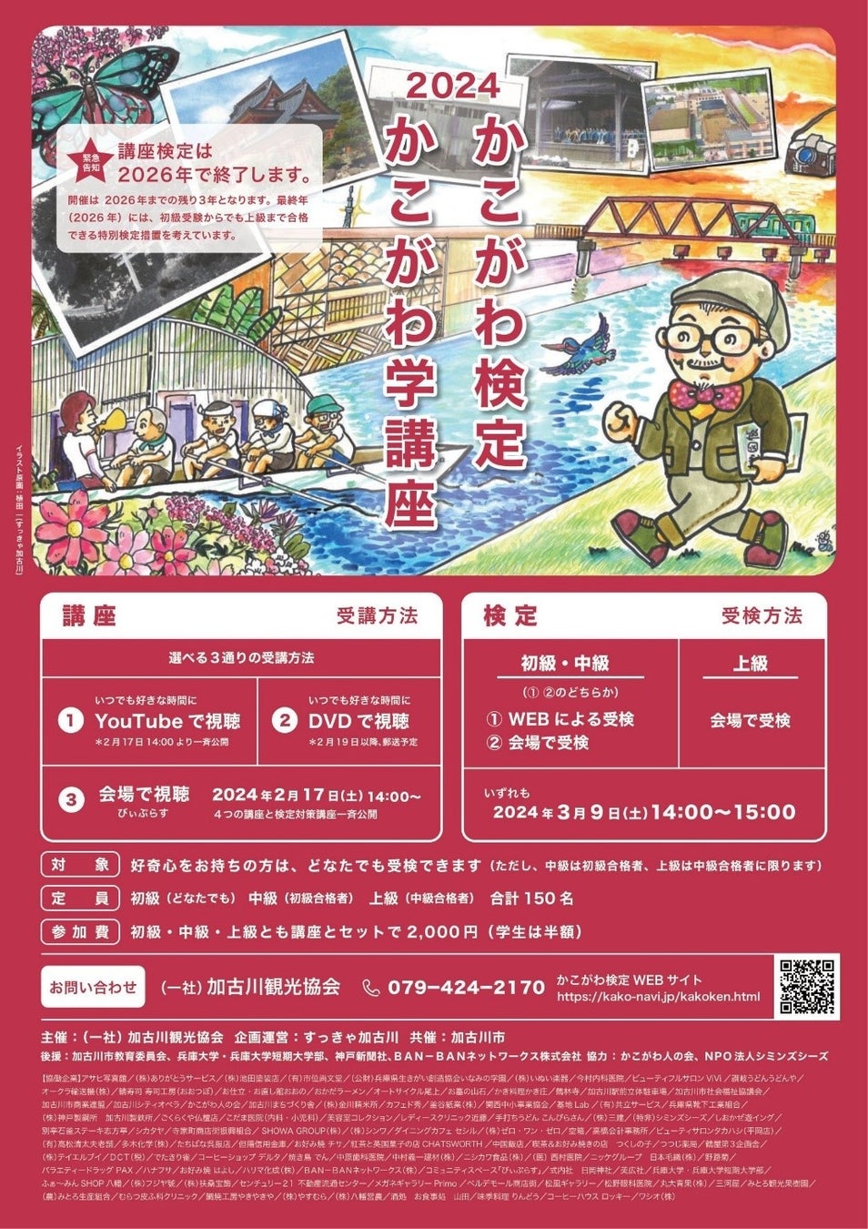 何気なく暮らし、眺めている加古川のまちの歴史や背景を知ることで、今まで素通りしていた風景が今までよりも愛おしく感じられます。「かこがわ学講座」と「かこがわ検定」は、そんな加古川のまちを知ってもらい、加古川のまちをもっと楽しんでもらうために平成19年(2007年)に開始し、今年で18回目の開催となります。「かこがわ検定」の合格者には(一社)加古川観光協会から「かこがわ人」認定証を授与します。
