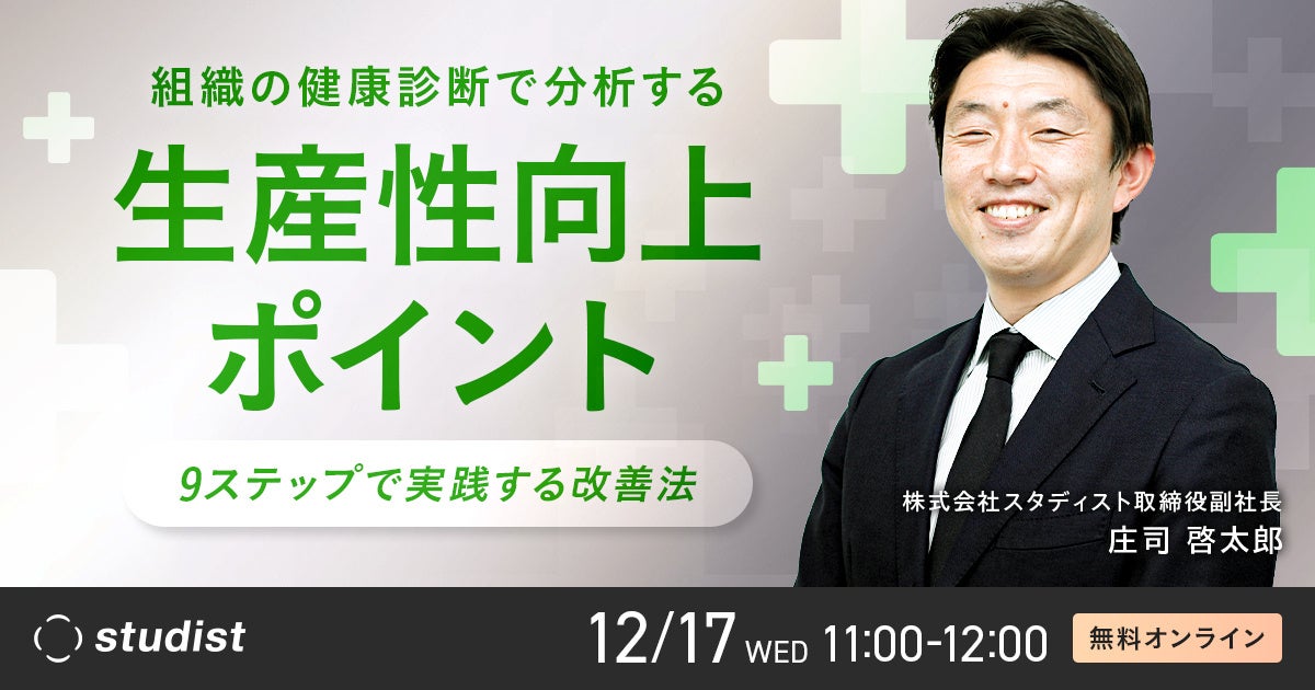 企業のオペレーション改革を支援する株式会社スタディスト(本社:東京都千代田区、代表取締役CEO:鈴木悟史、以下「スタディスト」)は、2025年12月17日(水)に「組織の健康診断で分析する生産性向上ポイント 〜9ステップで実践する改善法〜」と題したオンラインセミナーを開催いたします。