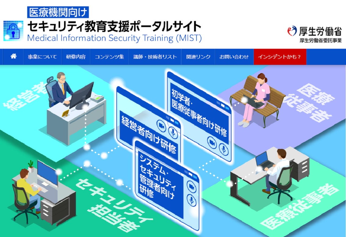 サイバーセキュリティの領域は、技術の進歩も早く、タイムリーな情報提供等を行うべく、これら背景のもと令和5年度の医療機関向けサイバーセキュリティ研修を9月より実施いたします。昨年に引き続き医療機関向けセキュリティ教育支援ポータルサイト(MIST:Medical Information Security Training)を通じて研修の申し込みをはじめ、サイバーセキュリティ教育に活用できるコンテンツ集の掲載など医療機関向けに継続的な教育支援をいたします。この機会に是非、ポータルサイトをご活用いただき、研修にご参加ください。