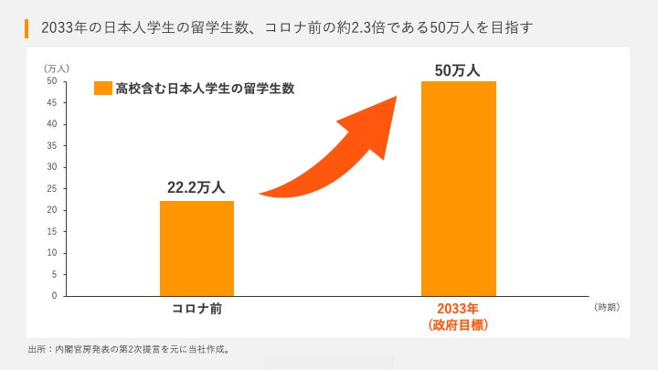 コロナ禍で激減した留学生を増やすべく、政府の教育未来創造会議は4月に第2次提言をとりまとめ、「2033年までに日本人の海外留学生50万人」を目標に掲げました。コロナ禍以前の日本人留学者数は、高校生なども含めると22.2万人とみられるため、今後10年でコロナ前の約2.3倍の留学者数を目指すこととなります。 留学の促進については、19日から21日にかけて開催されたG7首脳会議(広島サミット)でも議題の一つとして取り上げられるとされていました。