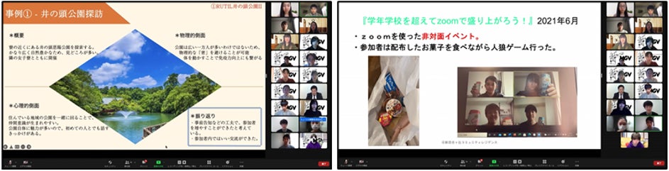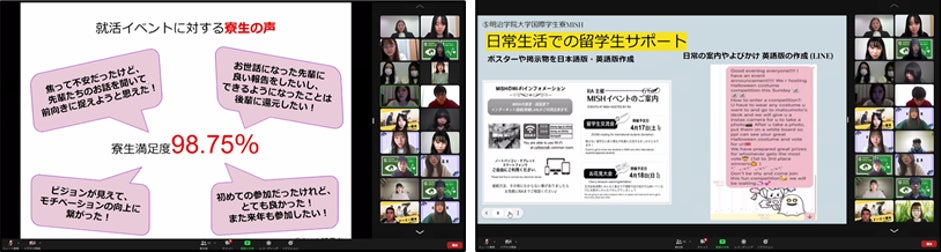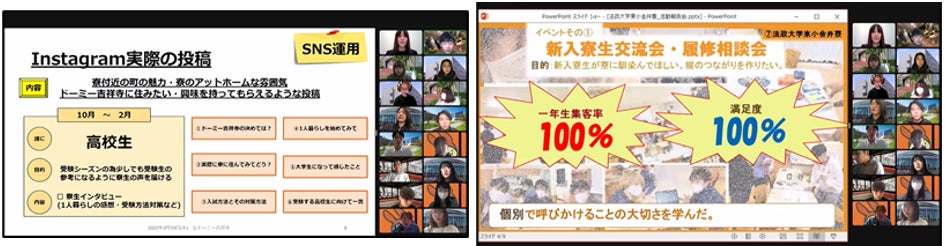 さらに議題ごとにグループを分けて6~8つの寮がプレゼンする「テーマ別ショートセッション」では「外部とのつながり(SDGs・国際交流・フリーテーマ)」「発信の工夫~SNS活用など~」「コロナ対策1」「コロナ対策2」の4つのテーマで展開。コロナ禍における新入寮生受け入れ、寮内交流のための季節ごとのイベント開催など、寮だからこそできる取り組みを発表しました。また、寮内外への情報発信においてはライングループや公式インスタグラムを活用。寮の魅力を広く伝えるための取り組みをプレゼンしました。