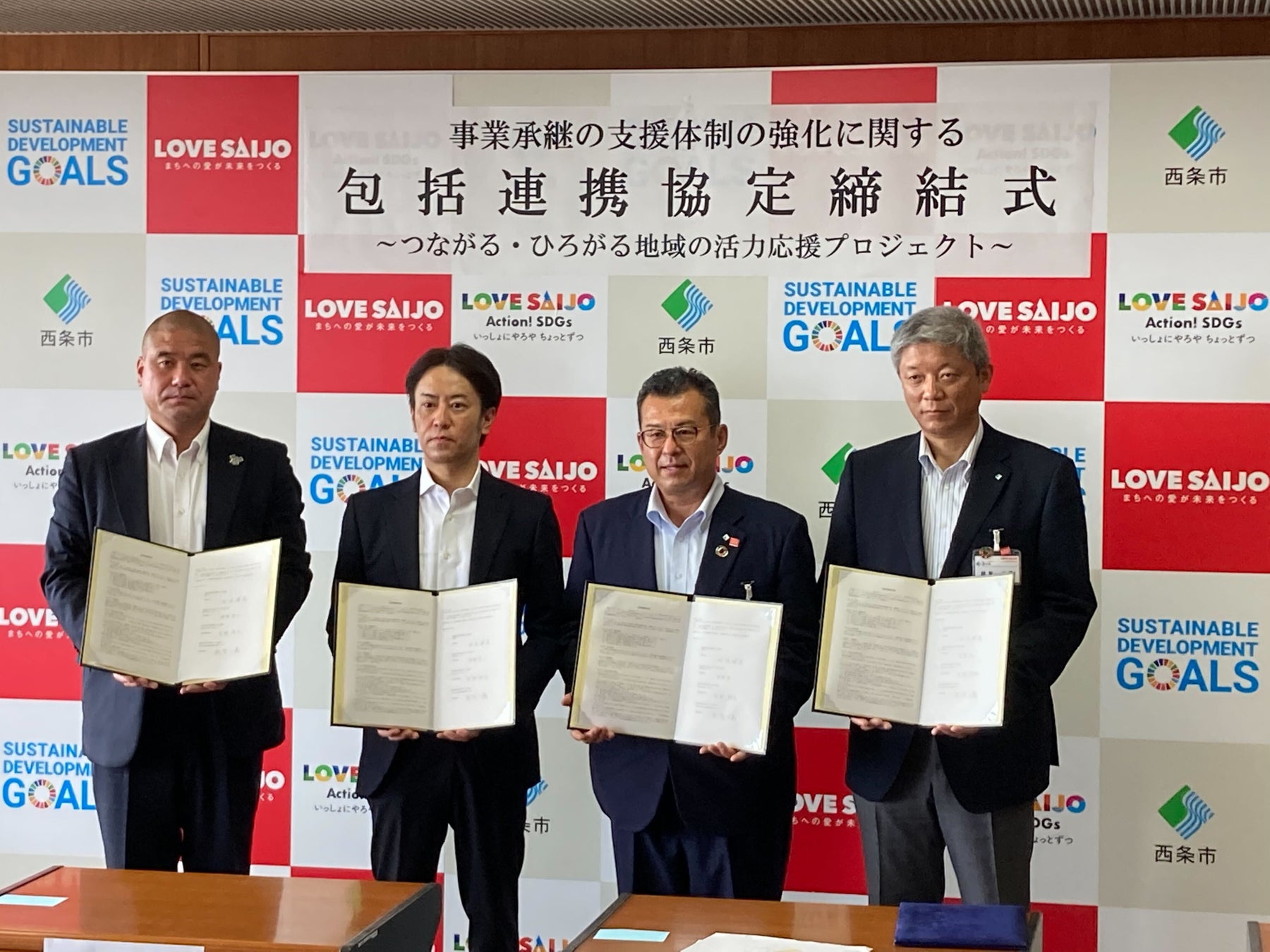 愛媛県西条市は、「住みたい田舎ベストランキング 若者世代部門 三年連続第一位」に選ばれるなど移住政策で注目を受けるまちですが、他地域同様、少子高齢化による地域活力の低下が懸念されていることから、中小企業等の事業承継を支援・促進することで中小企業等の活力の再生と地域の持続的な発展を目指すことを目的に、バトンズ、西条市、FC今治、SICSが包括連携協定を締結しました。