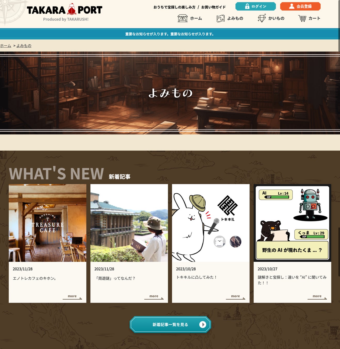 本サイトでは宝探し・謎解きに関する知識や、謎制作者のインタビュー記事など「よみもの」のコンテンツも充実しています。商品に関する記事だけではなく、謎解きと宝探しの魅力をさらに深く掘り下げるため、多彩なトピックを発信していきます。謎解き、宝探しの世界への興味を刺激し、新たなファンを創出することを目指します。
