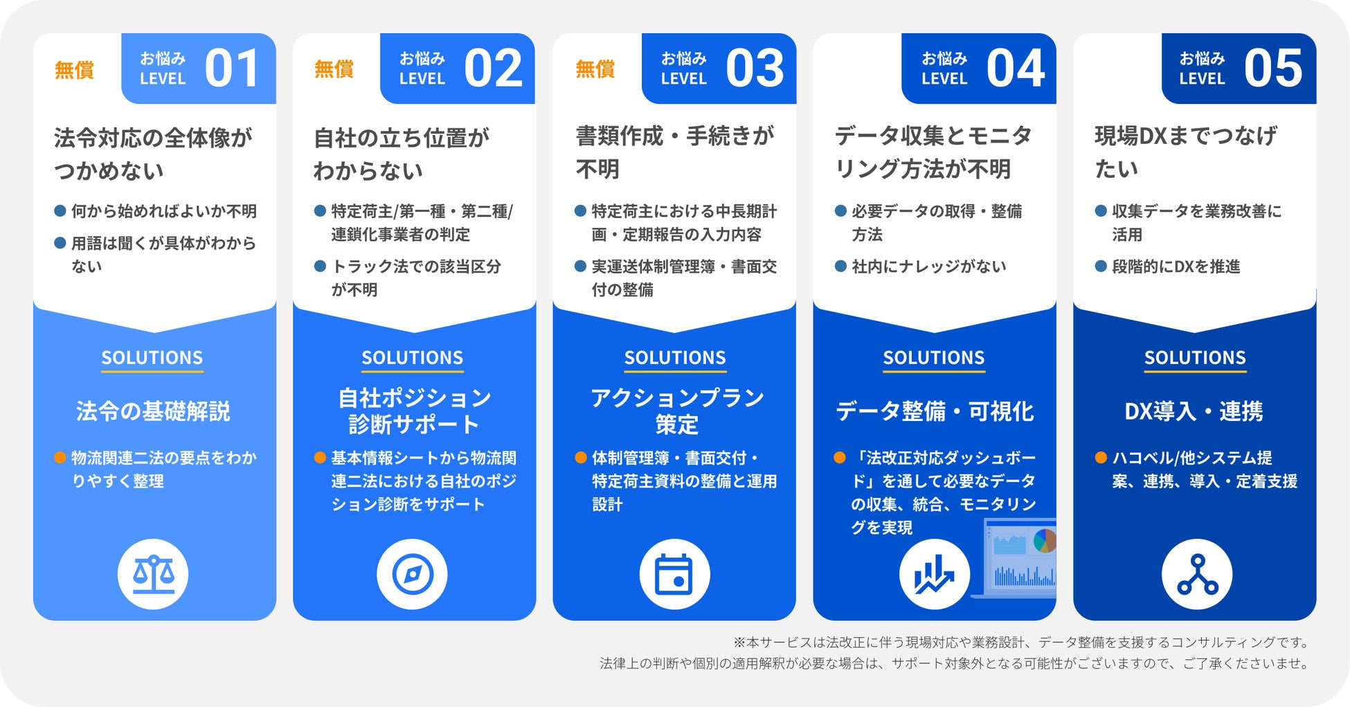 ※本サービスは法改正に伴う現場対応や業務設計、データ整備を支援するコンサルティングです。法律上の判断や個別の適用解釈が必要な場合は、サポート対象外となる可能性がございますので、ご了承ください。