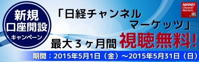 当社では2015年5月1日(金)より新規に口座開設頂いたお客様を対象に、「日経チャンネルマーケッツ」が最大で3ヶ月間無料で視聴頂けるキャンペーンを実施いたします。