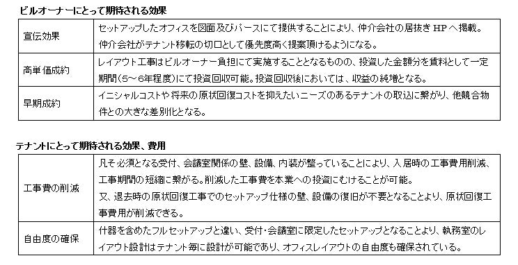 ・セットアップでの募集方法も一部の不動産会社にて実施しておりますが、セットアップを望むテナントのみしか取込できず、逆に顧客を限定してしまうことにも繋がっております。