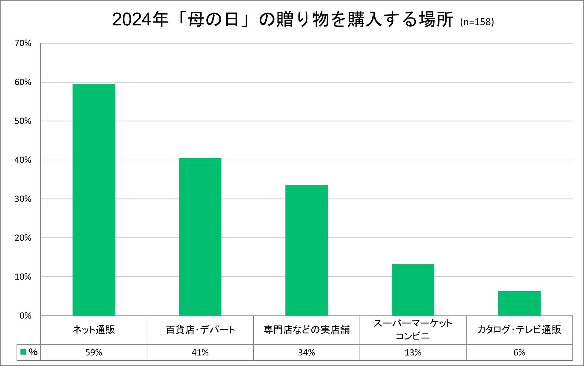 ・「母の日」の贈り物を購入する場所、「ネット通販」が59%