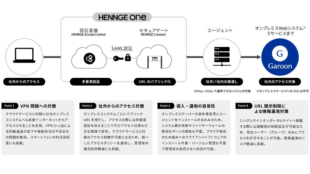 HENNGE株式会社(本社:東京都渋谷区、代表取締役社長:小椋 一宏)は、SaaS認証基盤(IDaaS)の「HENNGE One」の1機能で、社外から社内のオンプレミスシステムへのセキュアなアクセスを実現する「HENNGE Connect」が、サイボウズ株式会社が提供するグループウェア「Garoon」に対応したことを発表します。