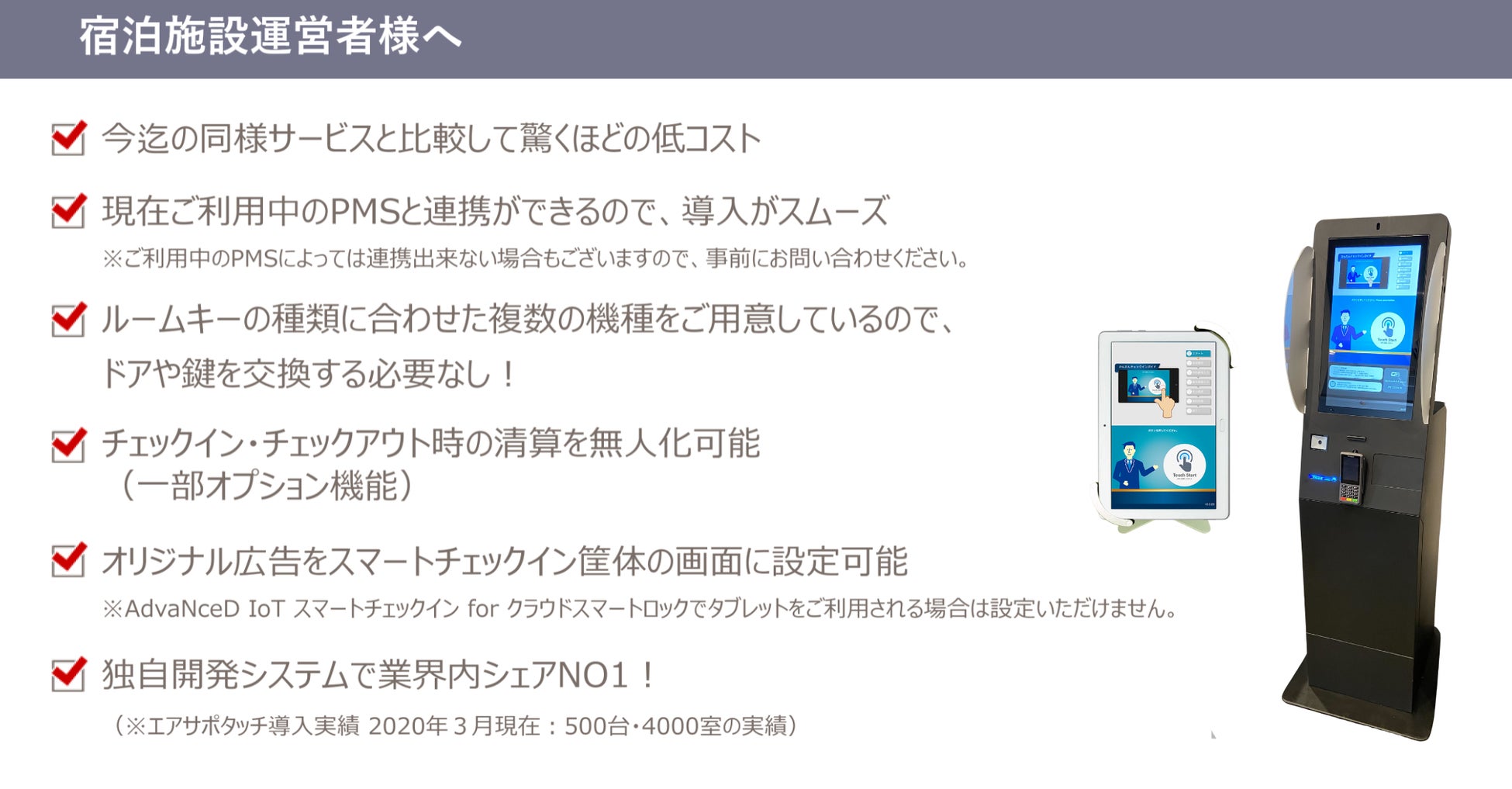 株式会社デバイスエージェンシー(大阪市西区)が提供する無人チェックインシステム「AdvaNceD IoT スマートチェックイン」シリーズは、2月25日より、株式会社ナバック(東京都港区)が提供する宿泊特化型・ビジネスホテル向けソリューション「FrontGateway」との連携を開始しました。