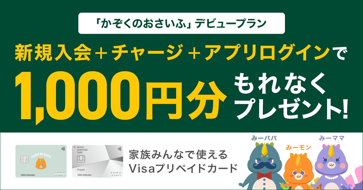 「かぞくのおさいふ」デビュープラン | 新規入会+チャージ+アプリログインで、1,000円分のプリペイドチャージをもれなくプレゼント!