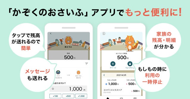 近年、生活の様々なシーンでキャッシュレス決済が急速に拡大しています。三井住友カードは、家族のお金の流れに着目し、家族間のお金のやり取りをキャッシュレスで簡単・便利にするためのプラットフォーム「かぞくのおさいふ」を2020年3月にリリースしました。専用スマートフォンアプリ「かぞくのおさいふアプリ」では、家族間でメッセージや残高のやり取りも簡単に行えるため、大変ご好評をいただいております。