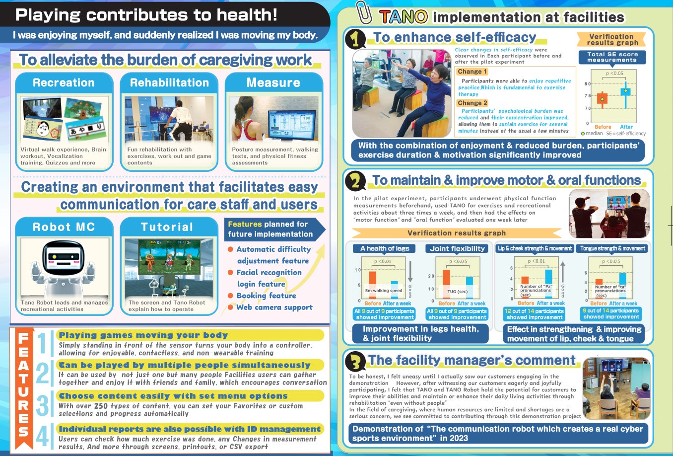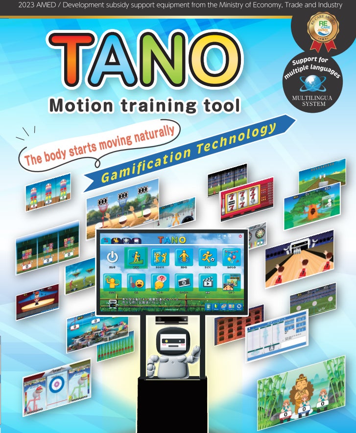TANOTECHは、令和5年度のAMED「ロボット介護機器開発等推進事業(開発補助)」において、「リアルサイバースポーツ環境を作るコミュニケーションロボット」が事業採択されました。この取り組みは、非接触型センサーに反応して身体の動きや音声で操作でき、介護施設でのレクリエーションや機能訓練・リハビリテーションを通じて、高齢者のコミュニティづくりや運動習慣化を目指しています。